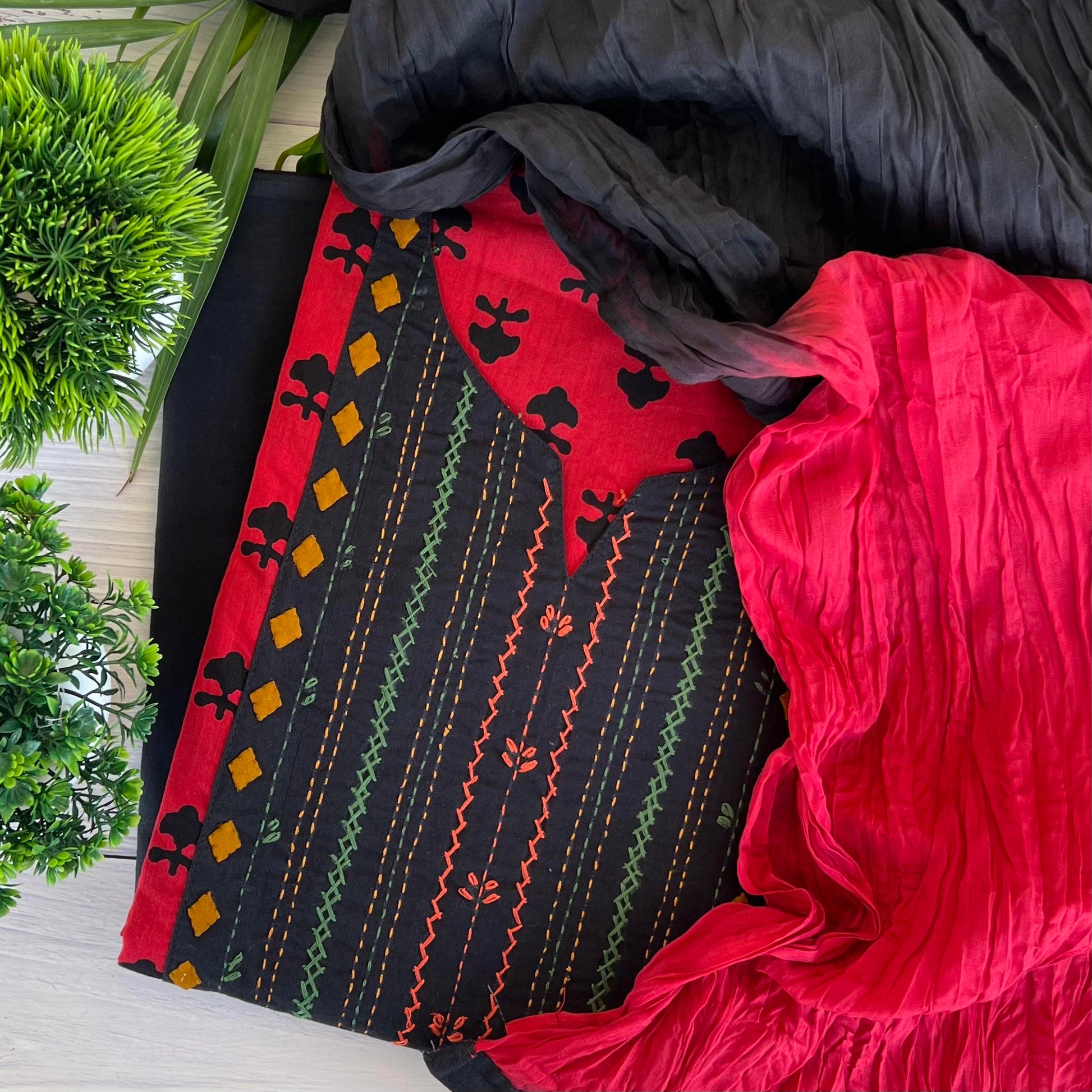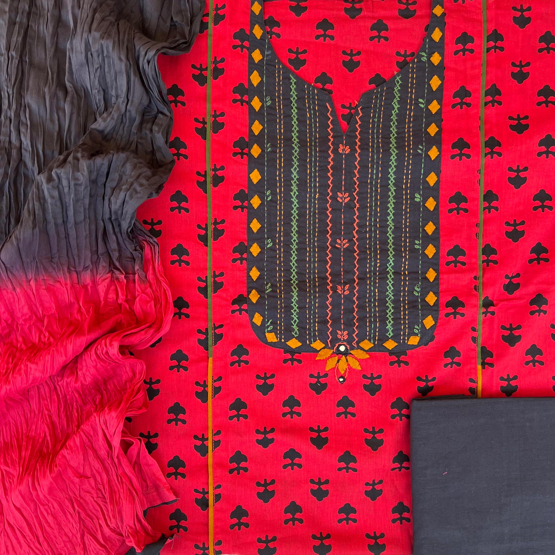 Kurta - Pure Cotton Bagh Print Kurta With Applique & Kantha Work (2.5Mtr)