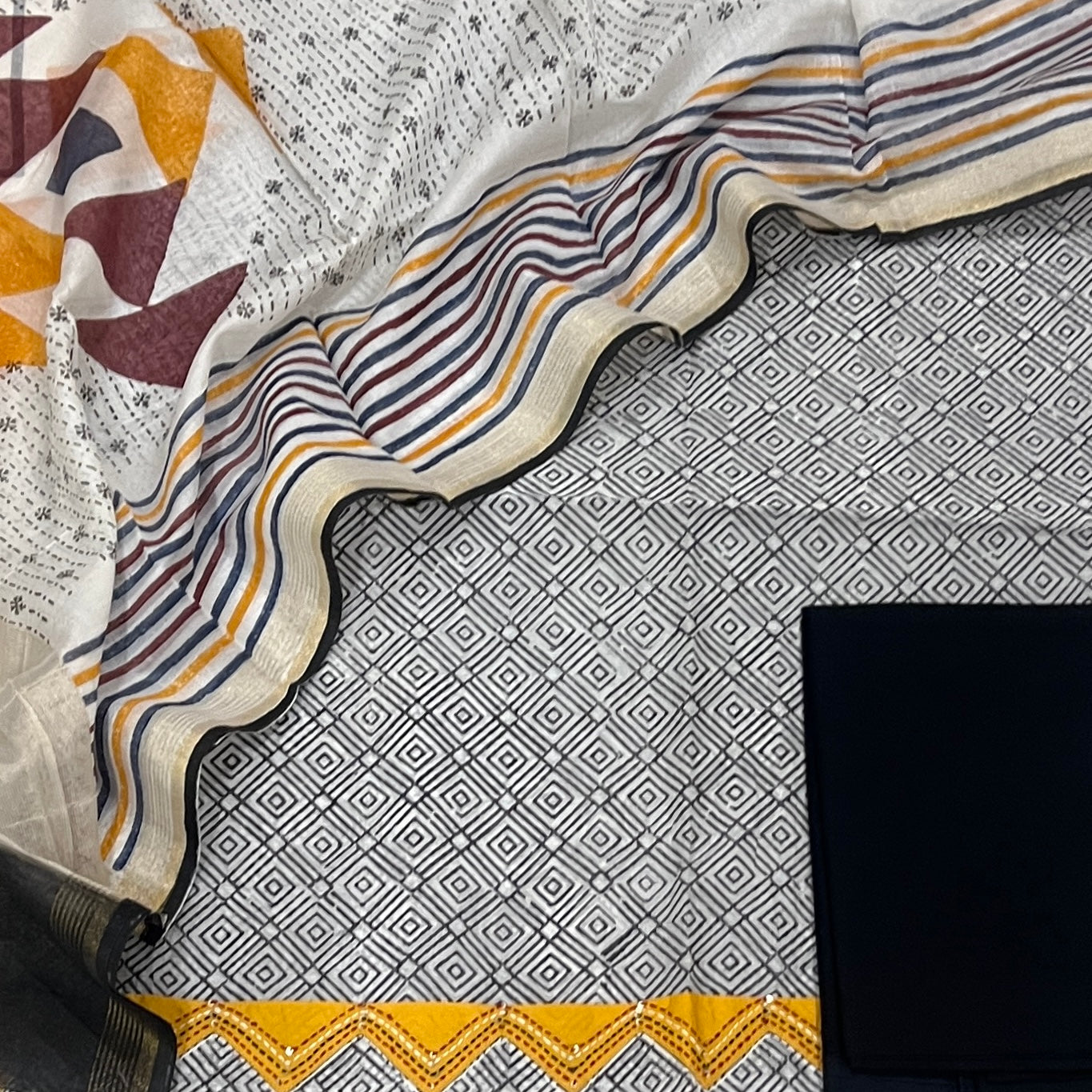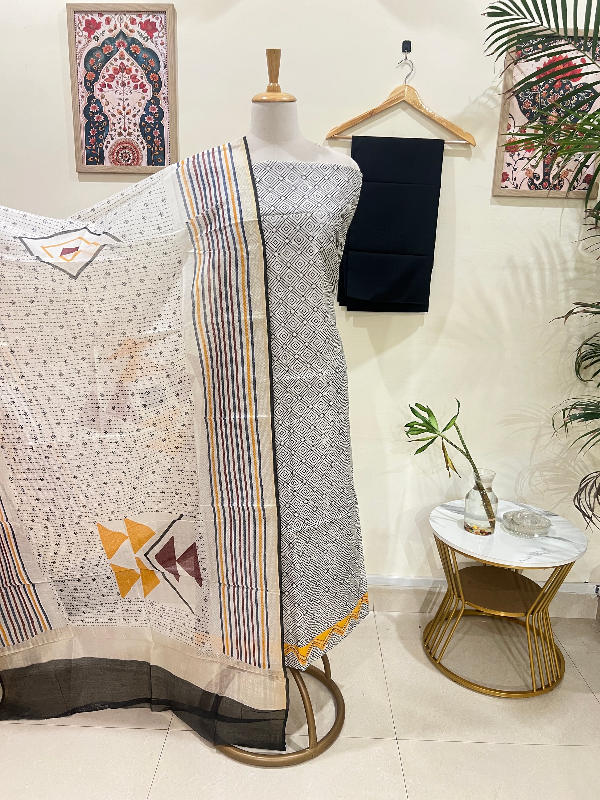 Kurta - Fine Chanderi Silk MonoChrome Block Print Kurta (2.5Mtr)