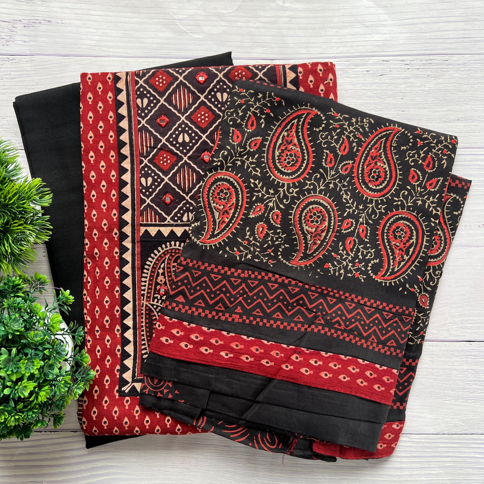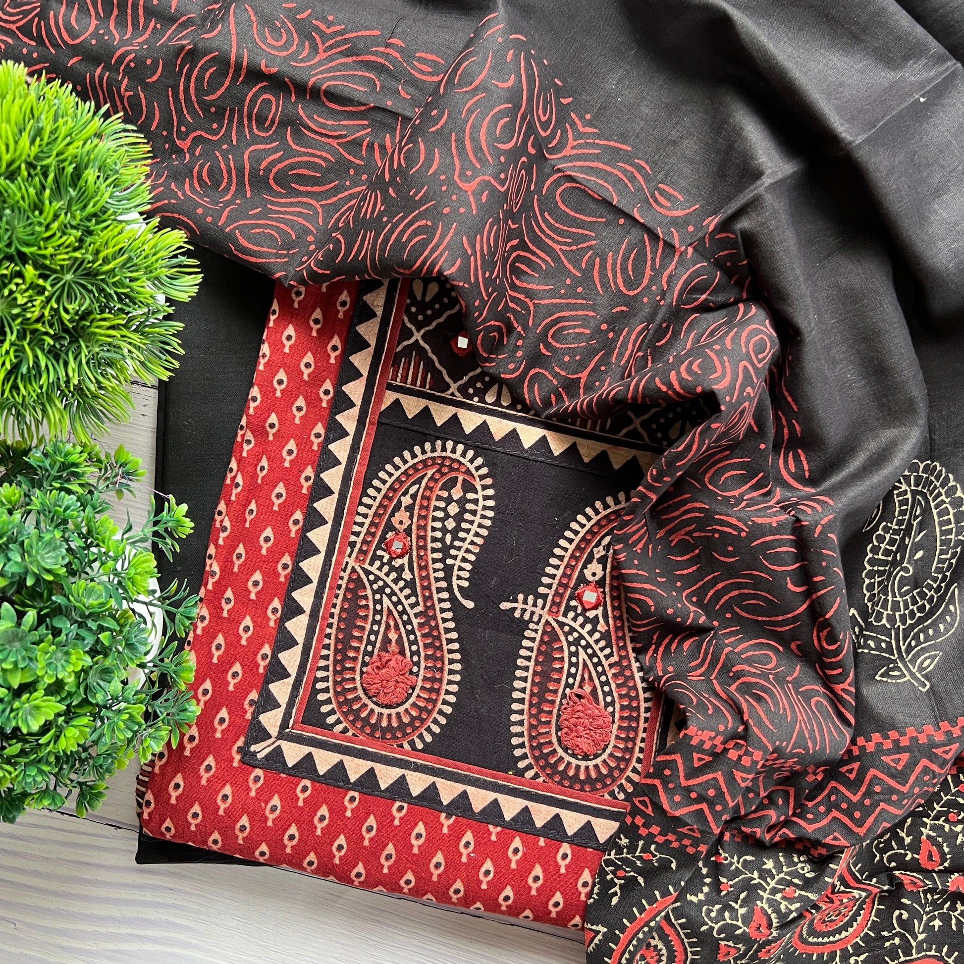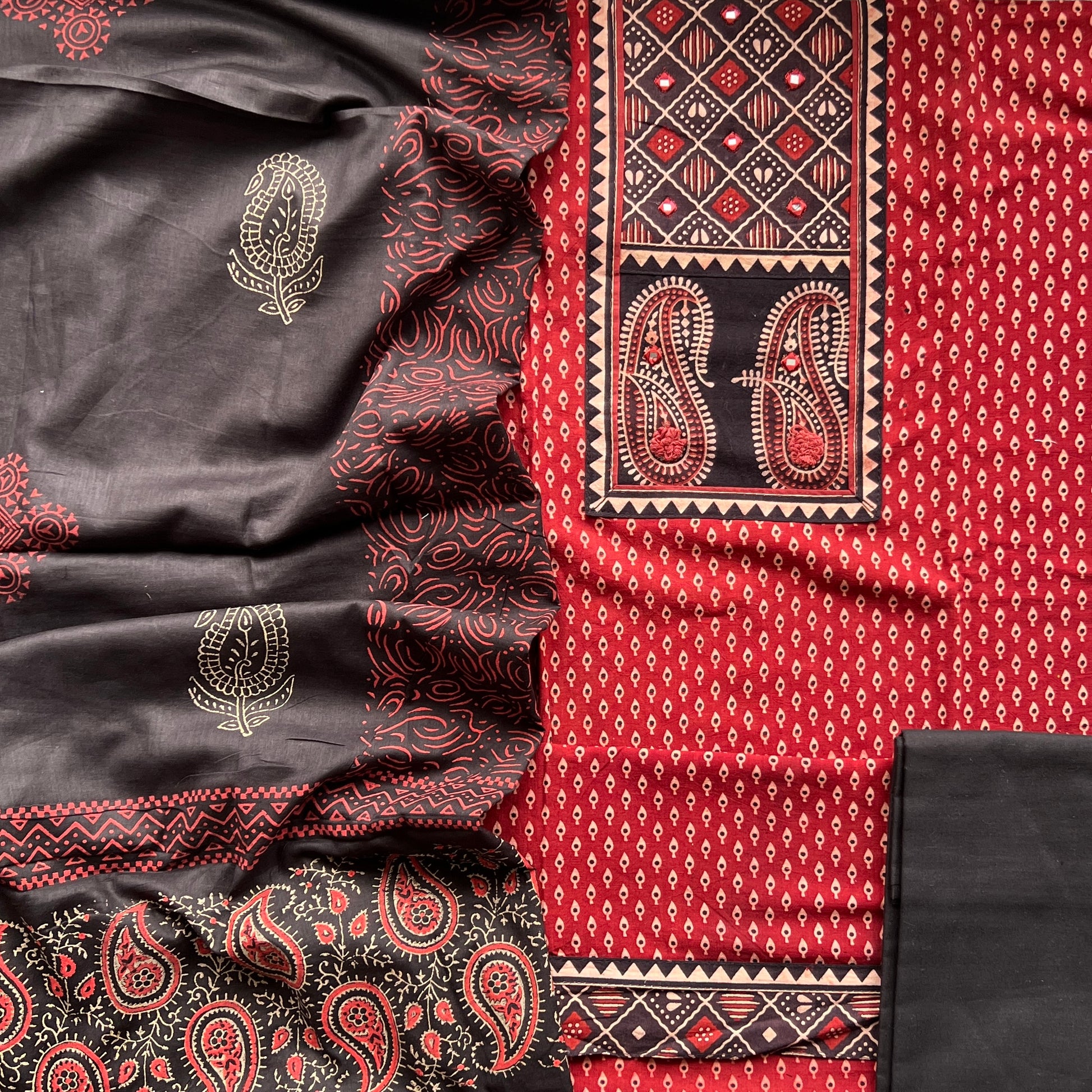 Kurta - Pure Cotton Ajrakh And Block Kurta With Fine Mirror And Handwork At Neck (2.5Mtr)