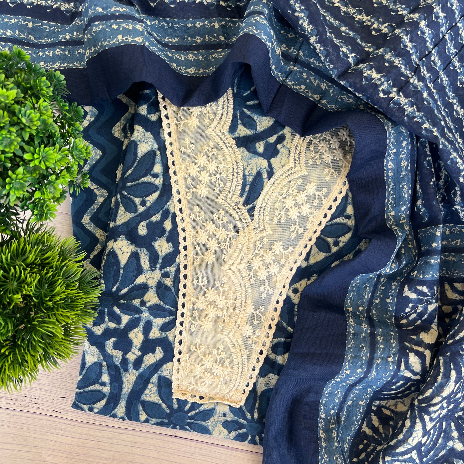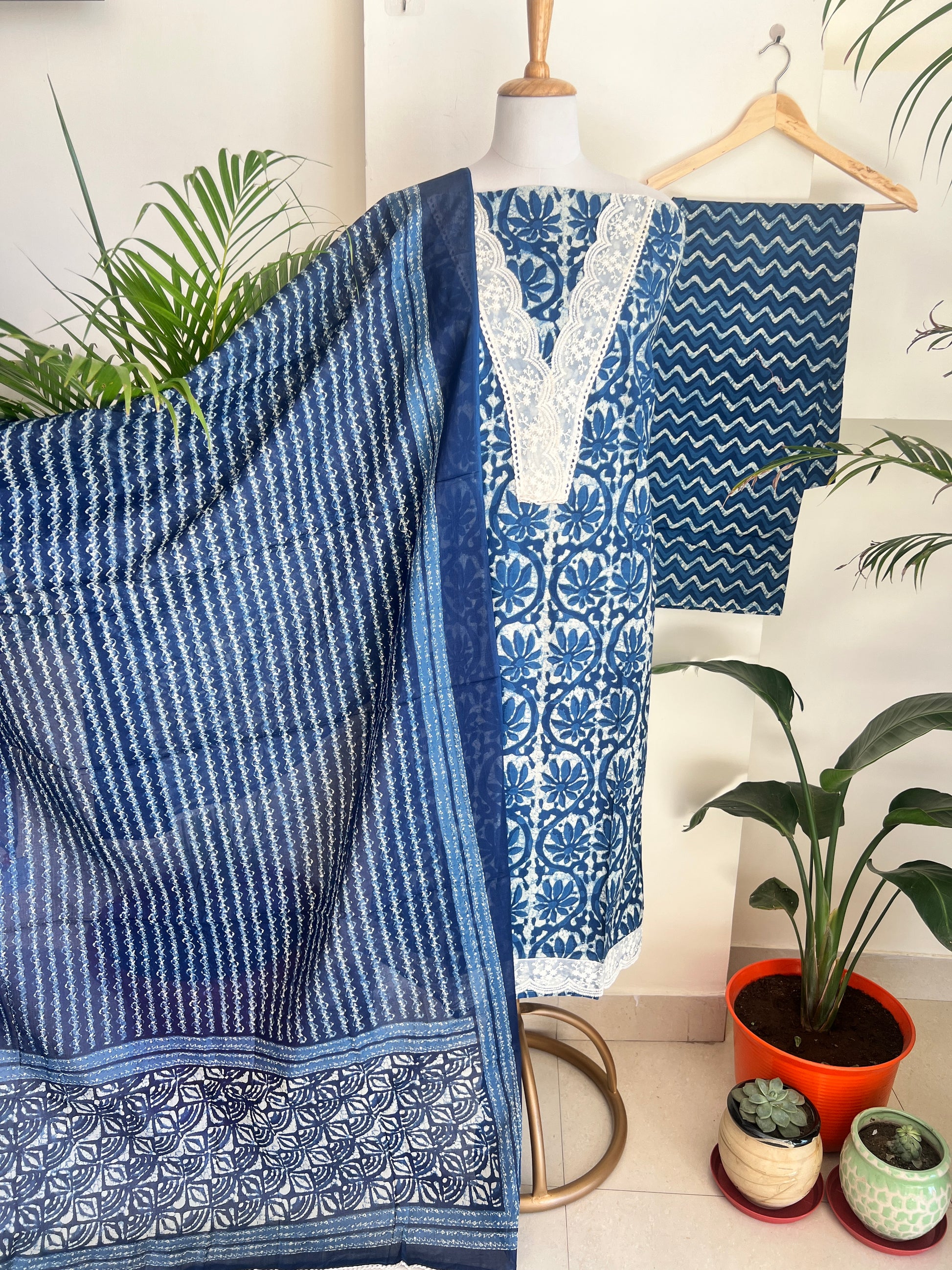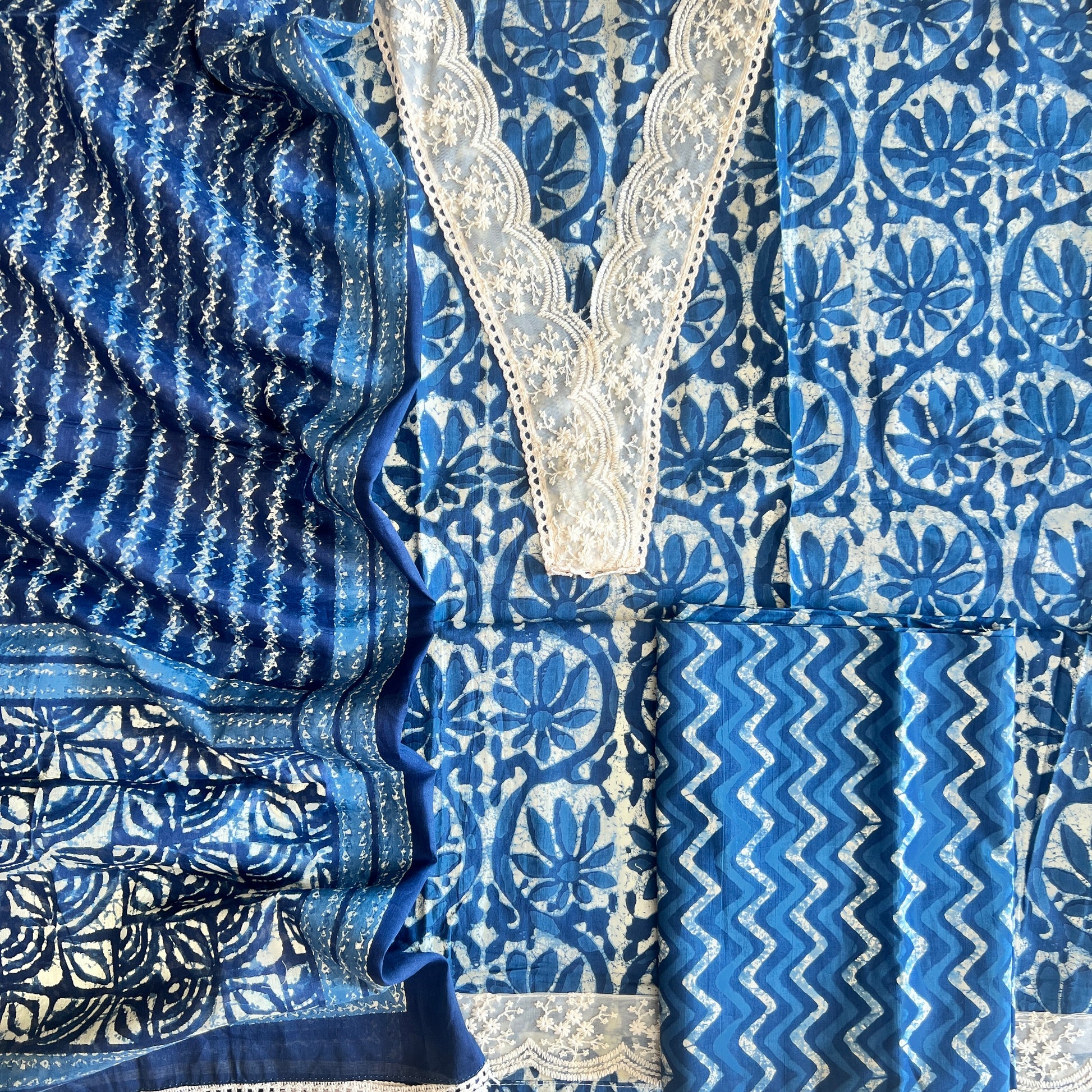 Kurta - Pure Cotton Block Print And Embroidery Lace Kurta (2.5Mtr)