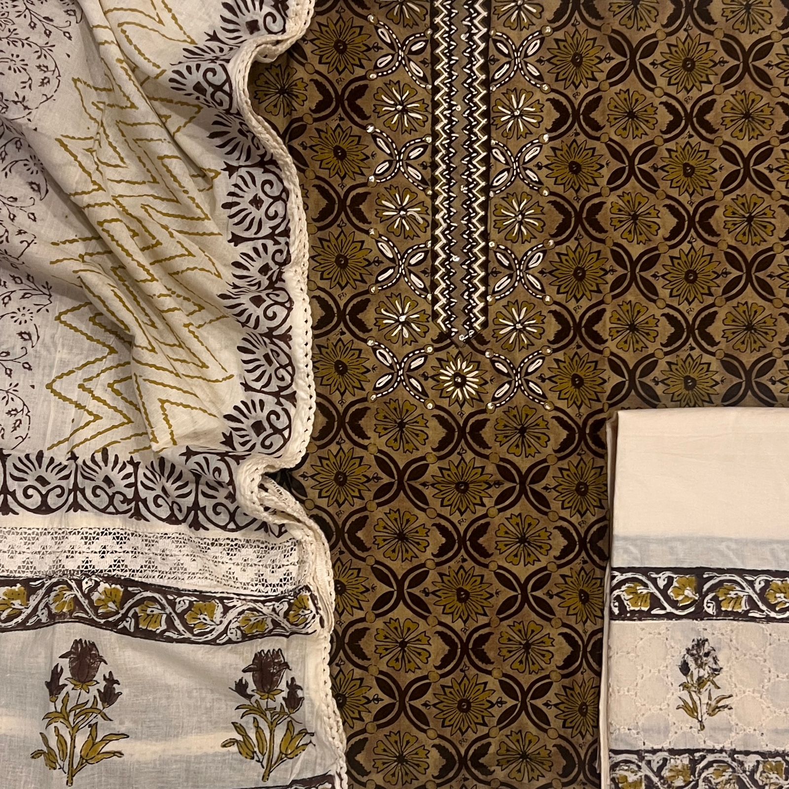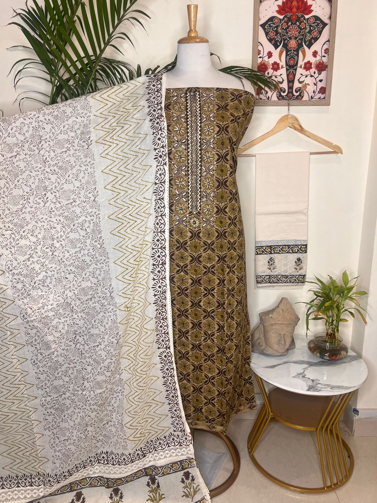 Kurta - Pure Cotton Block Print Kurta With Handwork At NeckLine (2.5Mtr)