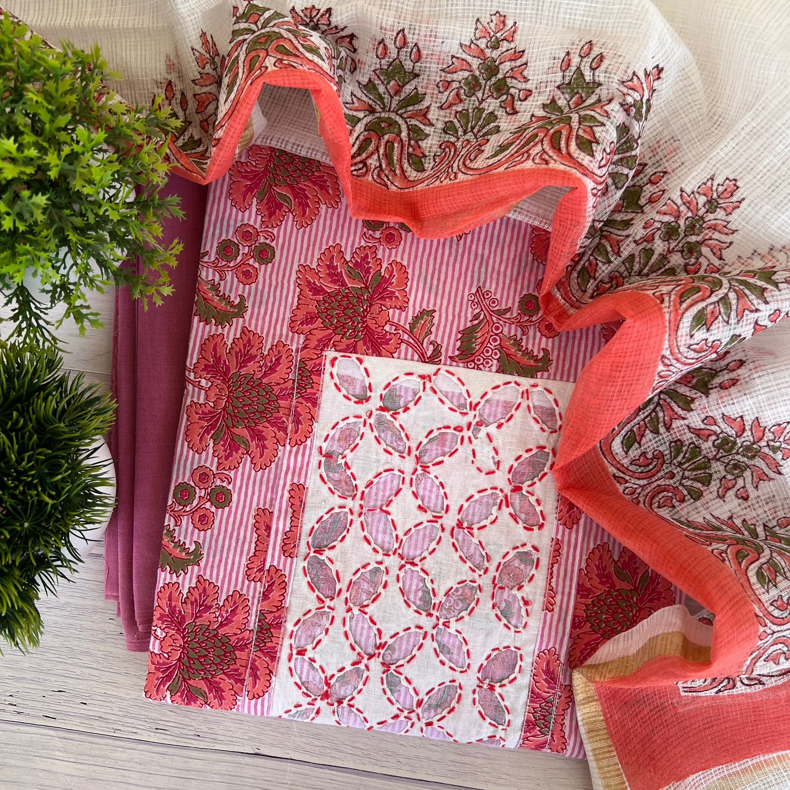 Kurta: Pure Cotton Block Print Kurta with elegant Kantha Work at the Neck (2.5 Mtr)
