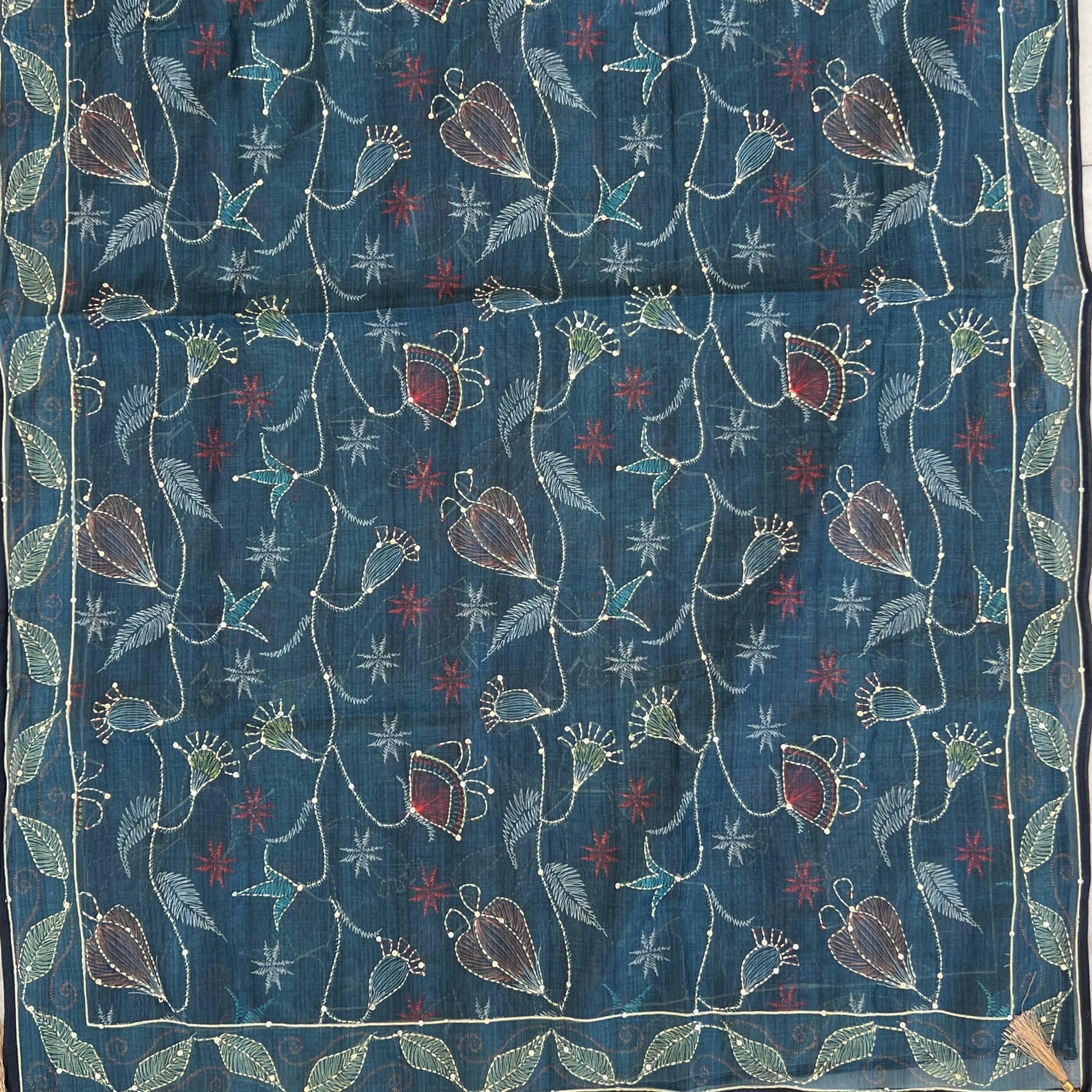 Dupatta - Cotton Silk Kalamkari Print Kantha Work Dupatta With Handmade Tussles (2.5Mtr)