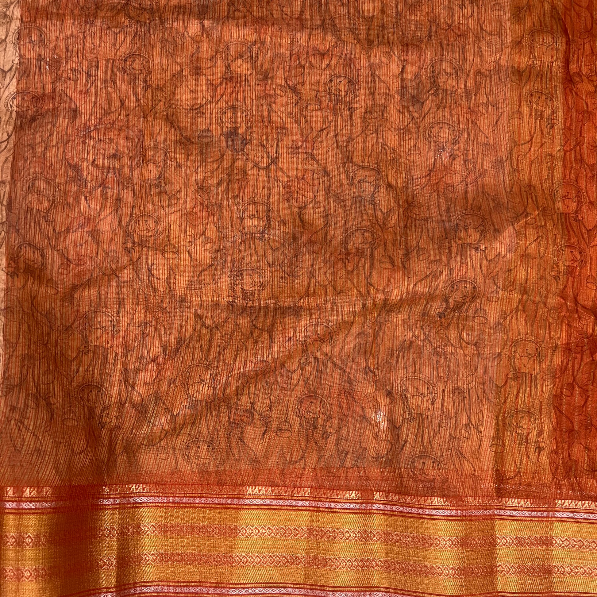 Elegance meets tradition in this Cotton Silk Pichwai Print Saree, beautifully enhanced with a rich Copper Zari Border. Finished with handmade tussles, this drape is a timeless blend of artistry and sophistication.