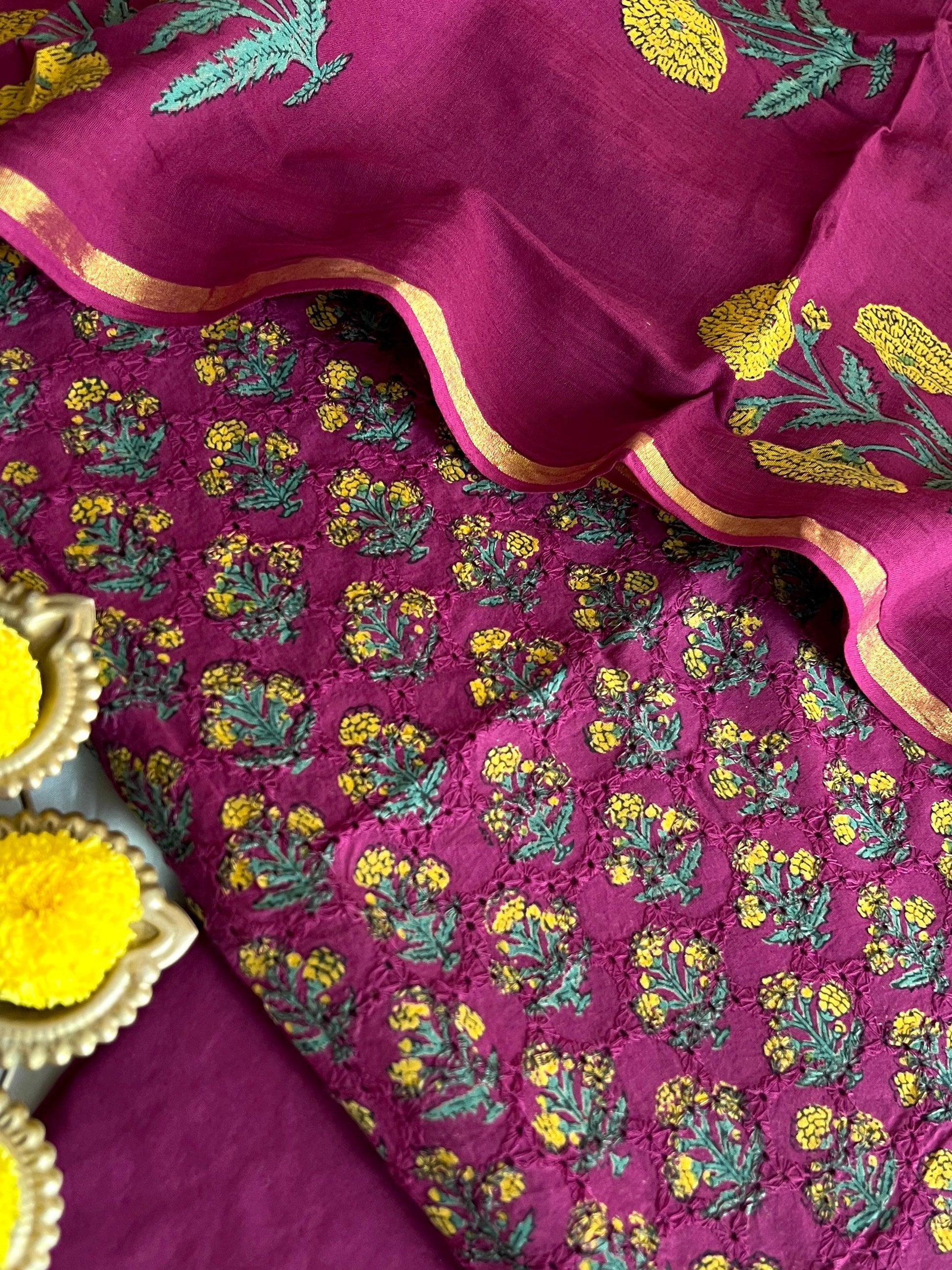 Kurta - Pure Cotton Hakoba Block Print Kurta With Kantha Work At Daman (2.5Mtr)