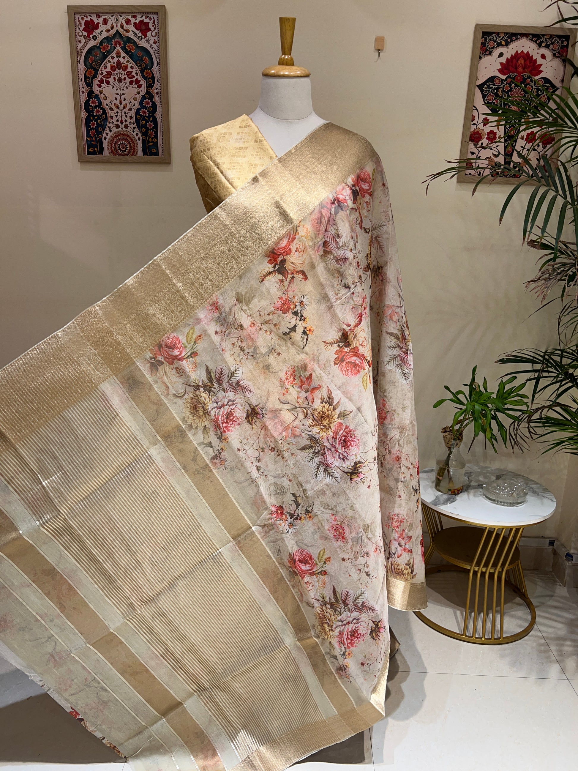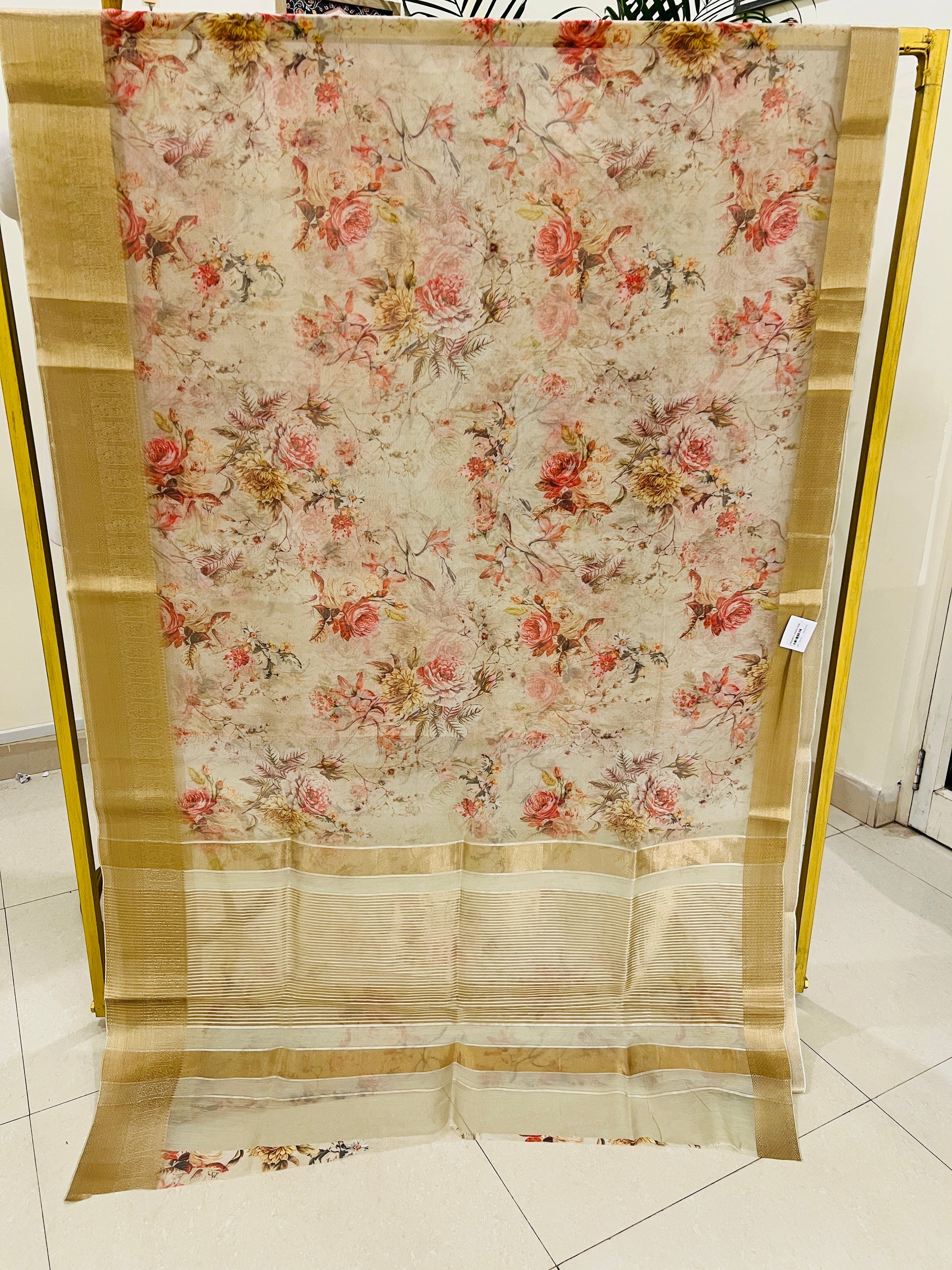 Graceful and contemporary, this Fine Organza Digital Print Saree is adorned with a shimmering Golden Zari Border, making it a perfect blend of charm and elegance for every occasion.
