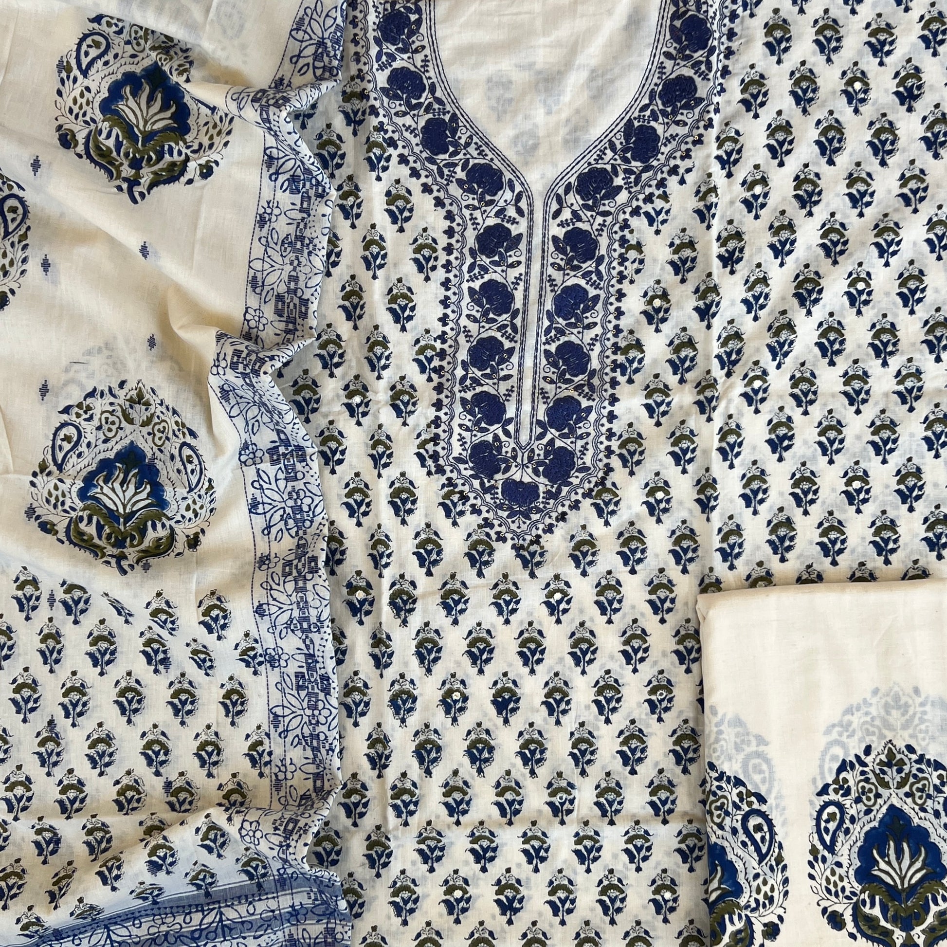 Kurta - Handloom Cotton Block Print Kurta With Fine Embroidery (2.5mtr)