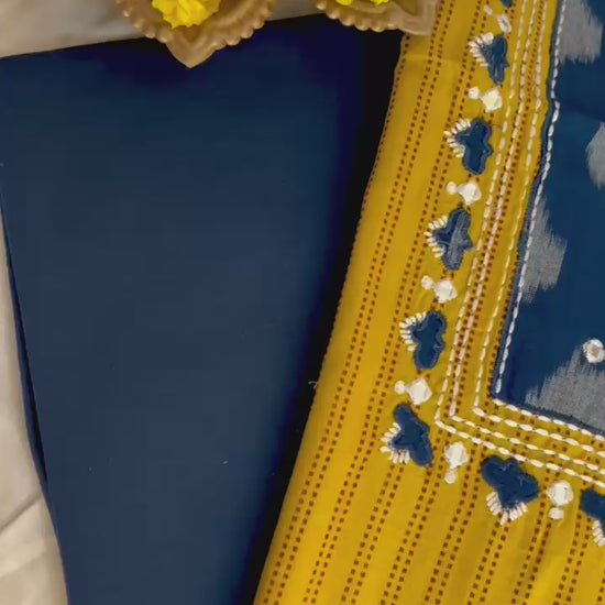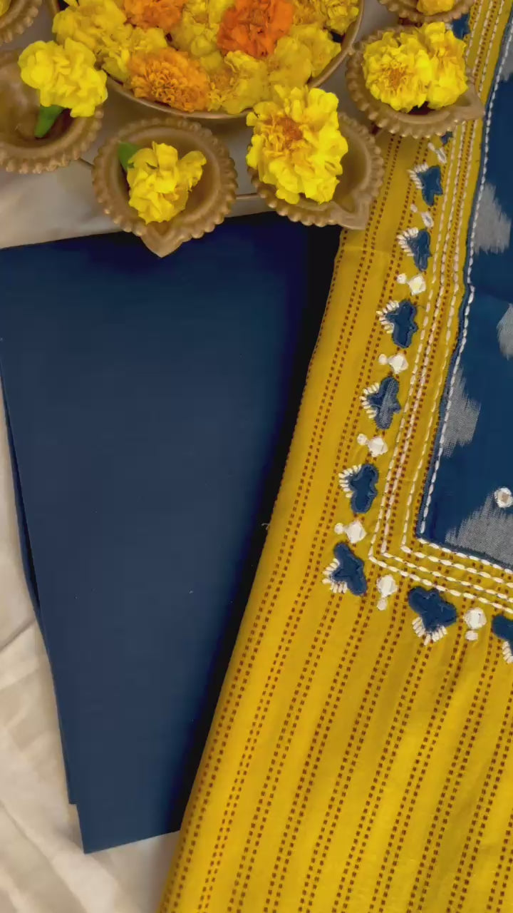 Kurta - Handloom Cotton Kurta With Fine Handwork & Ikkat Patchwork At Neckline (2.5Mtr)