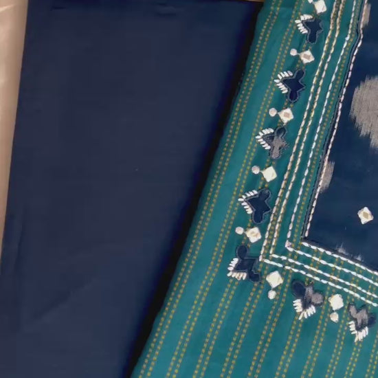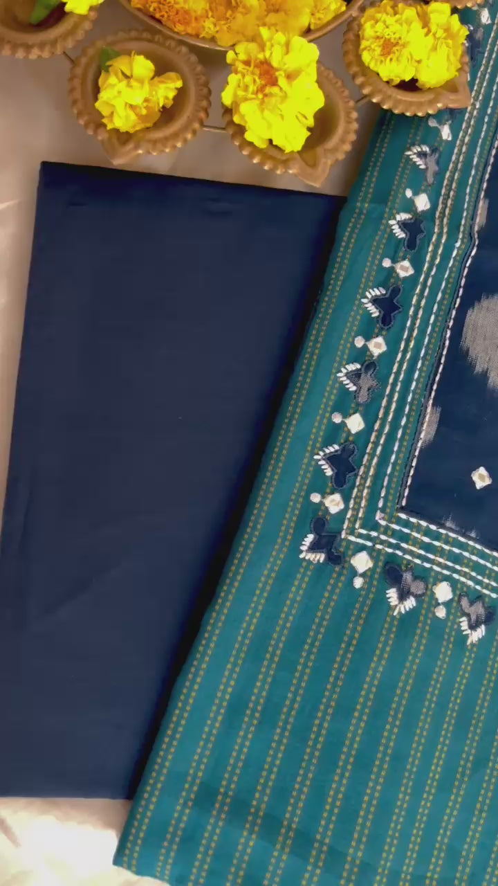 Kurta - Handloom Cotton Kurta With Fine Handwork & Ikkat Patchwork At Neckline (2.5Mtr)