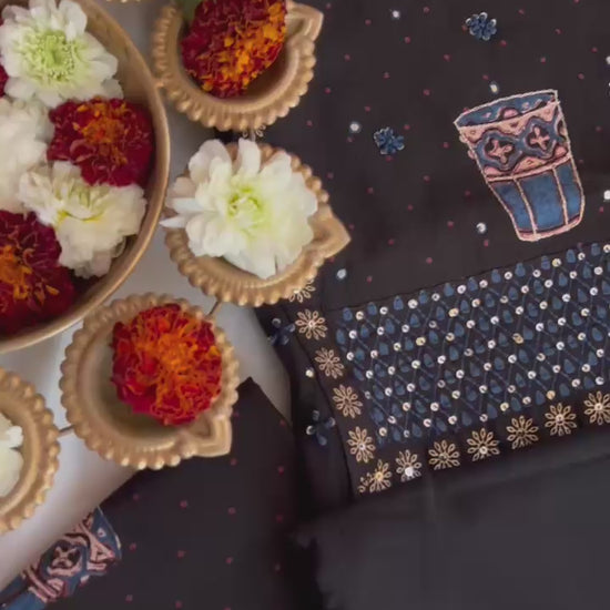 Kurta - Handloom Cotton Kurta With Fine Handwork At Neckline & Block Print Detailing At Daman (2.5Mtr)