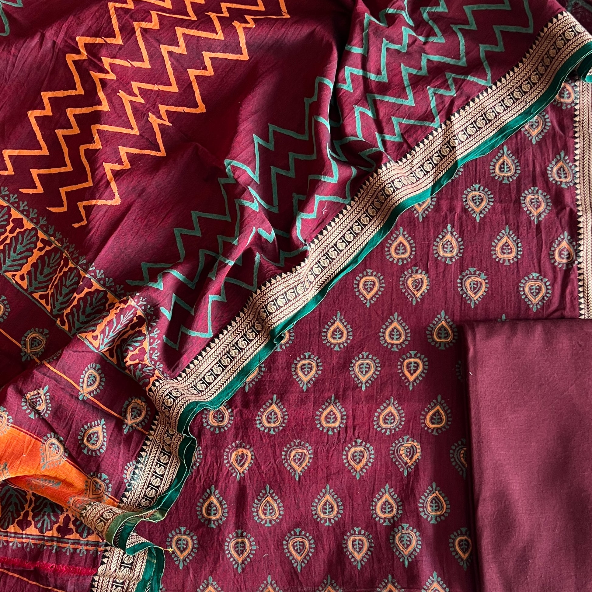 Kurta - Soft Handloom Cotton Block Print Kurta With Nizam Border (2.5Mtr)