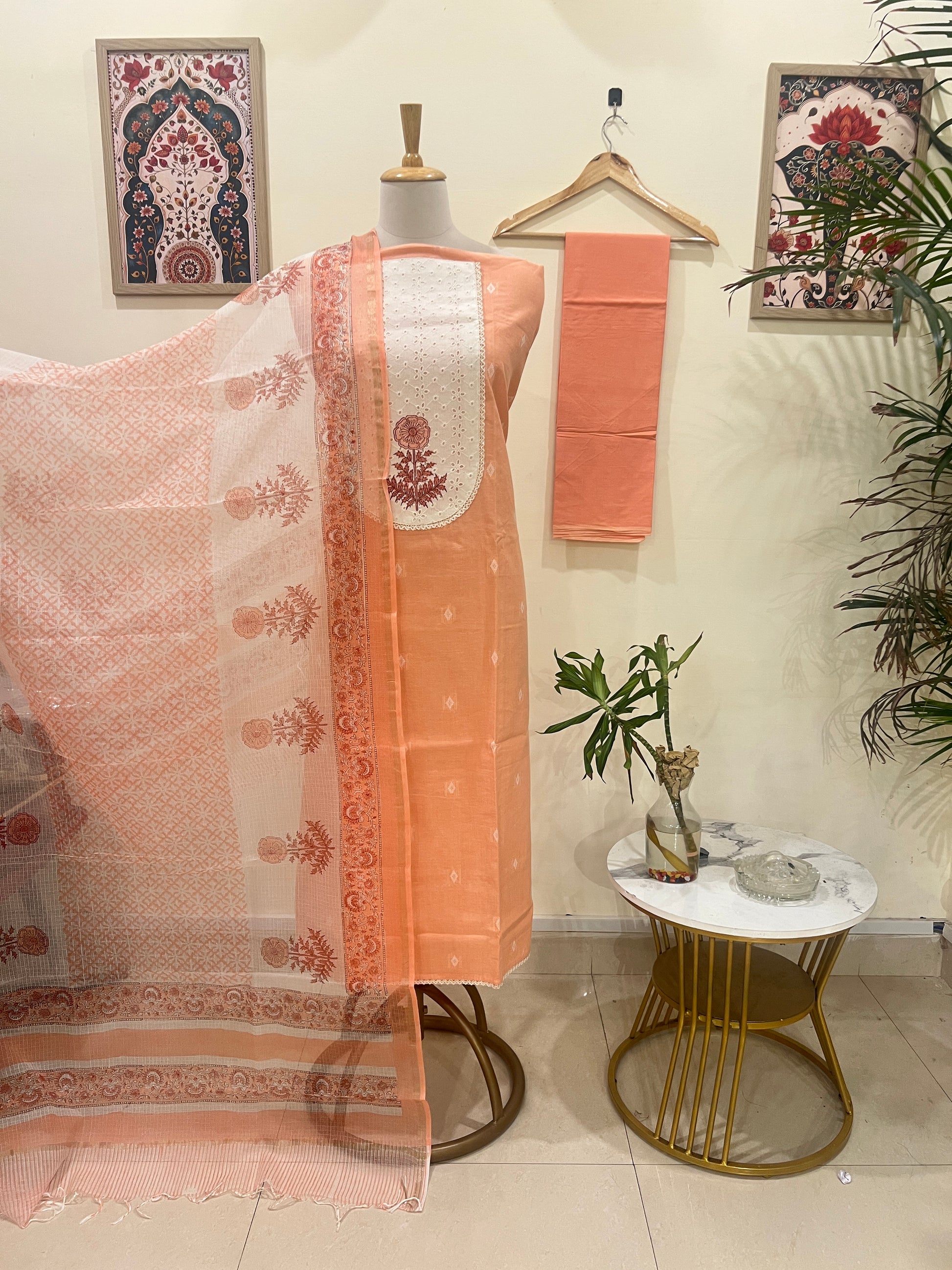 Kurta - Soft Handloom Cotton Kurta With Hakoba Block Print Neck Pattern (2.5Mtr)
