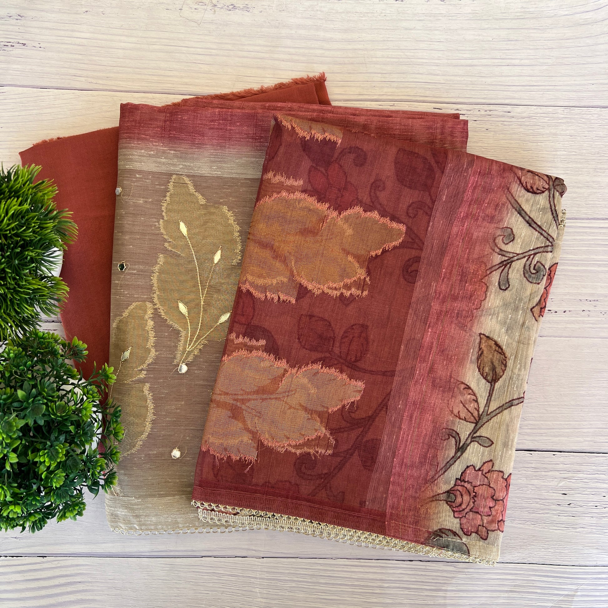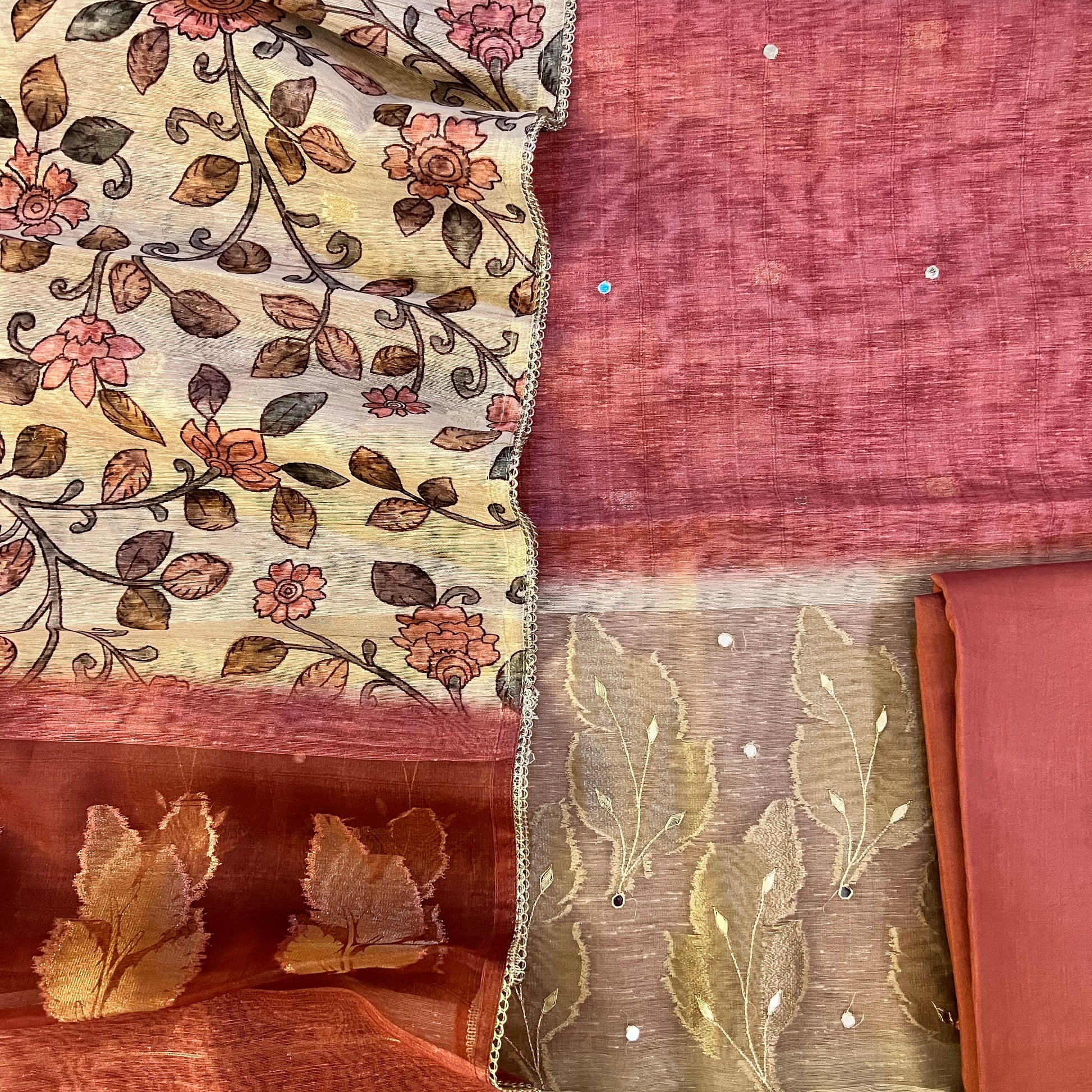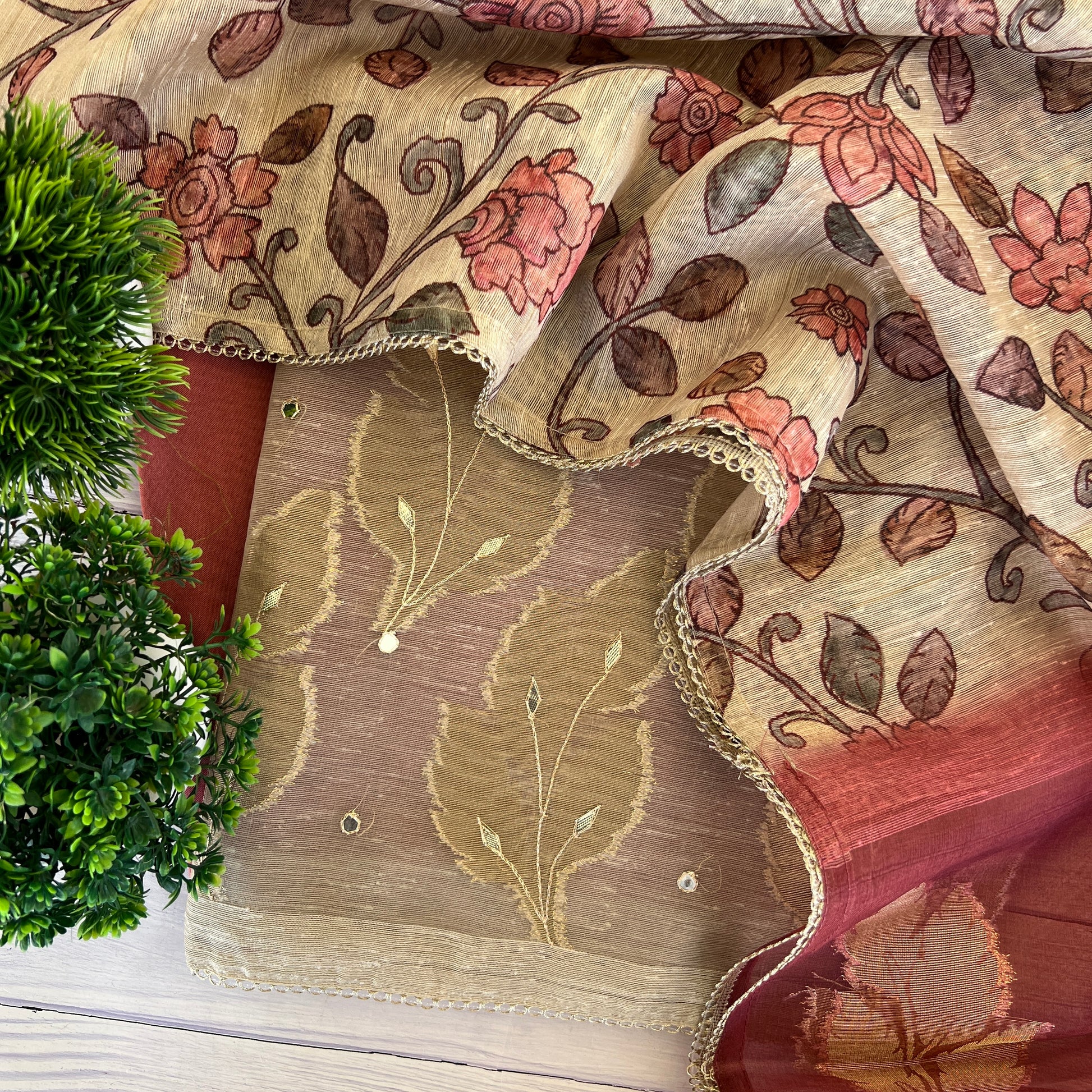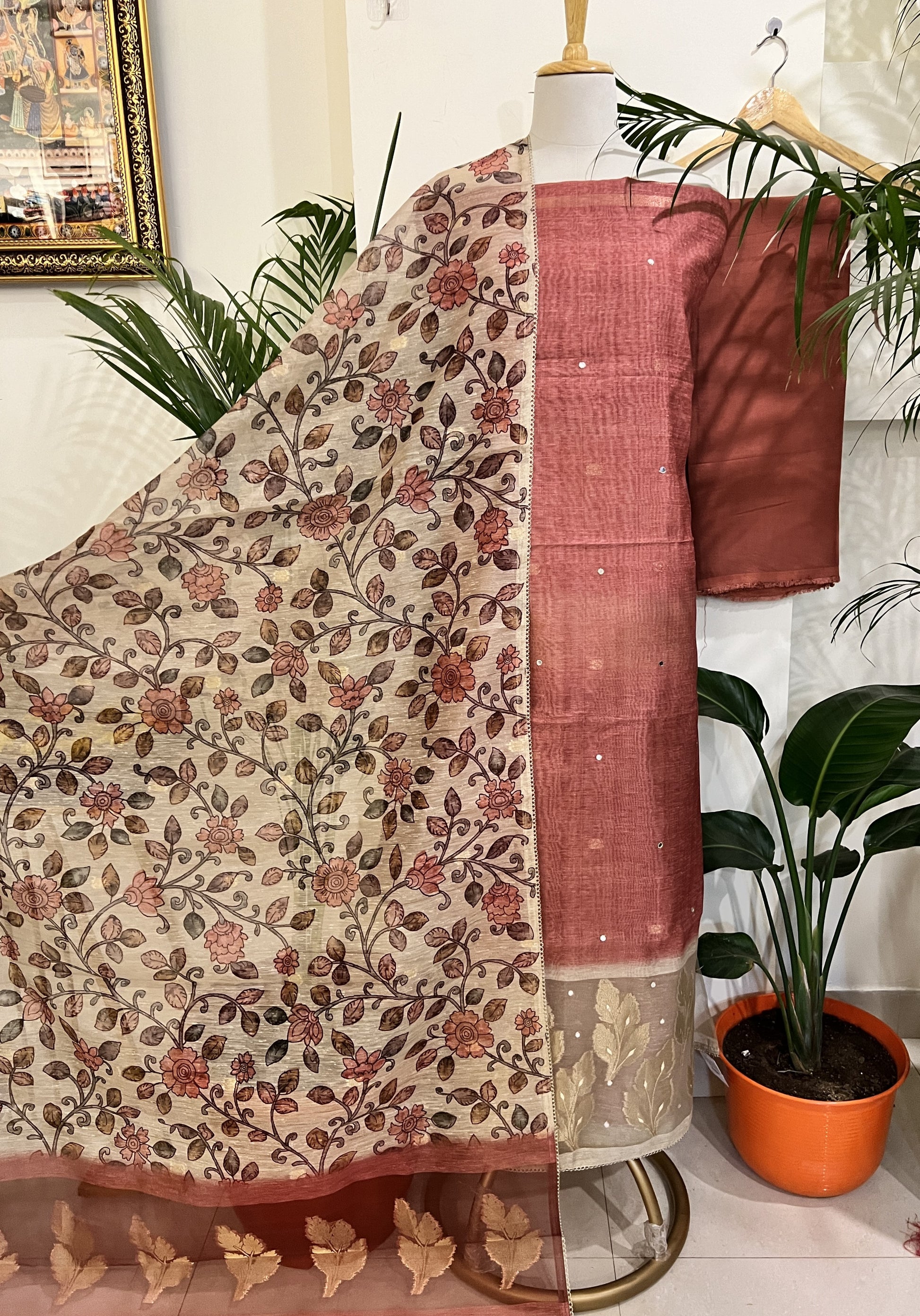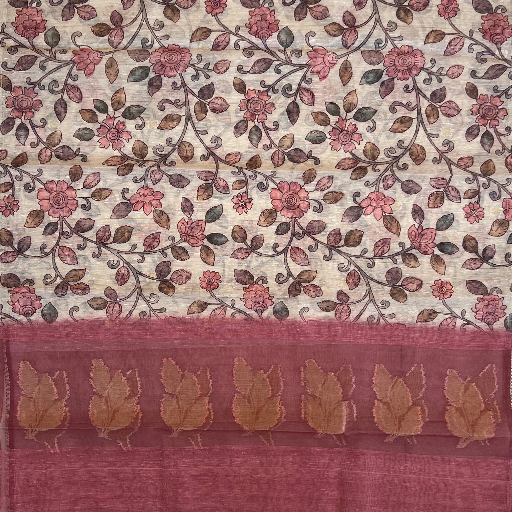 Dupatta - Fine Slub Linen Chanderi Ghotta Work Dupatta With Kalamkari Print (2.5Mtr)