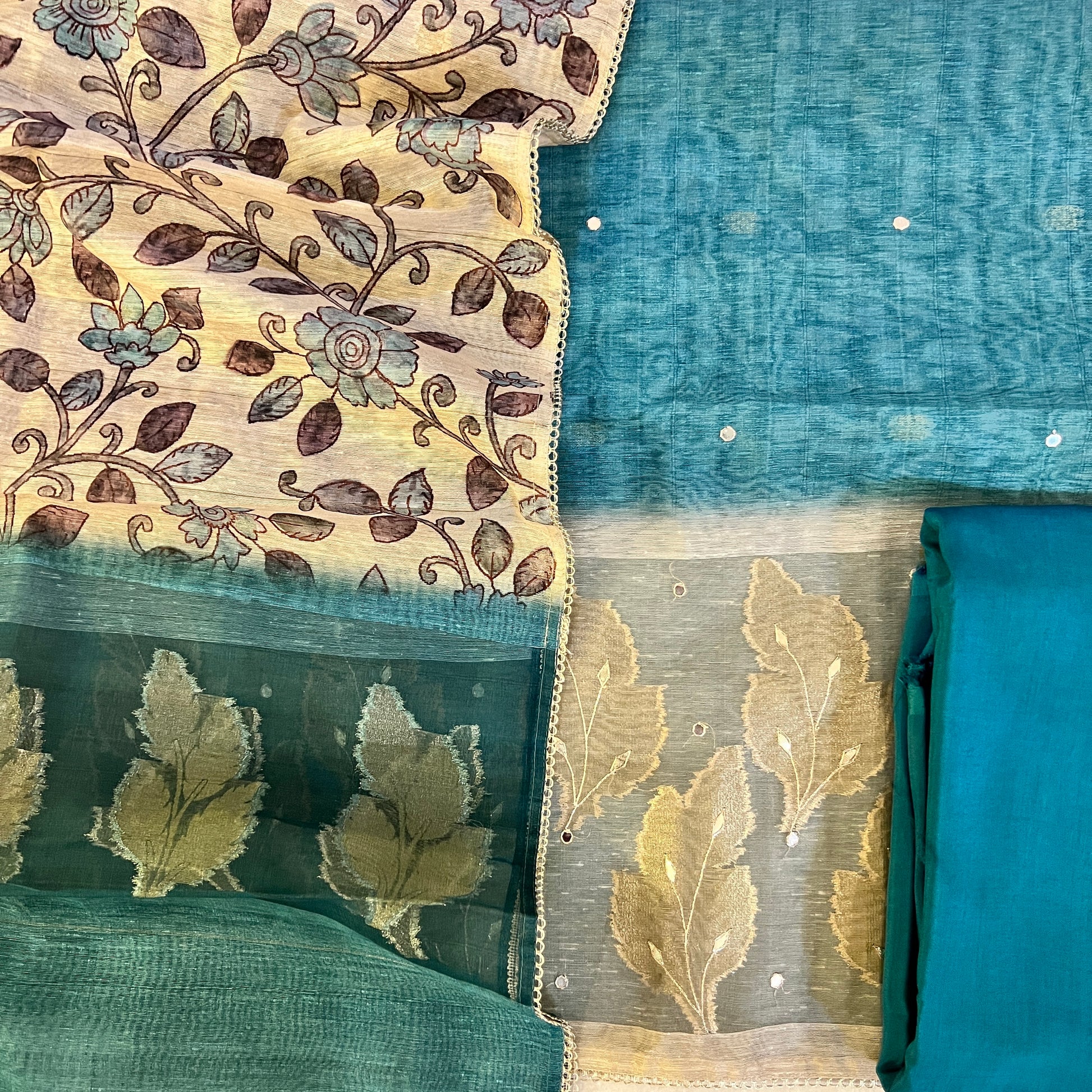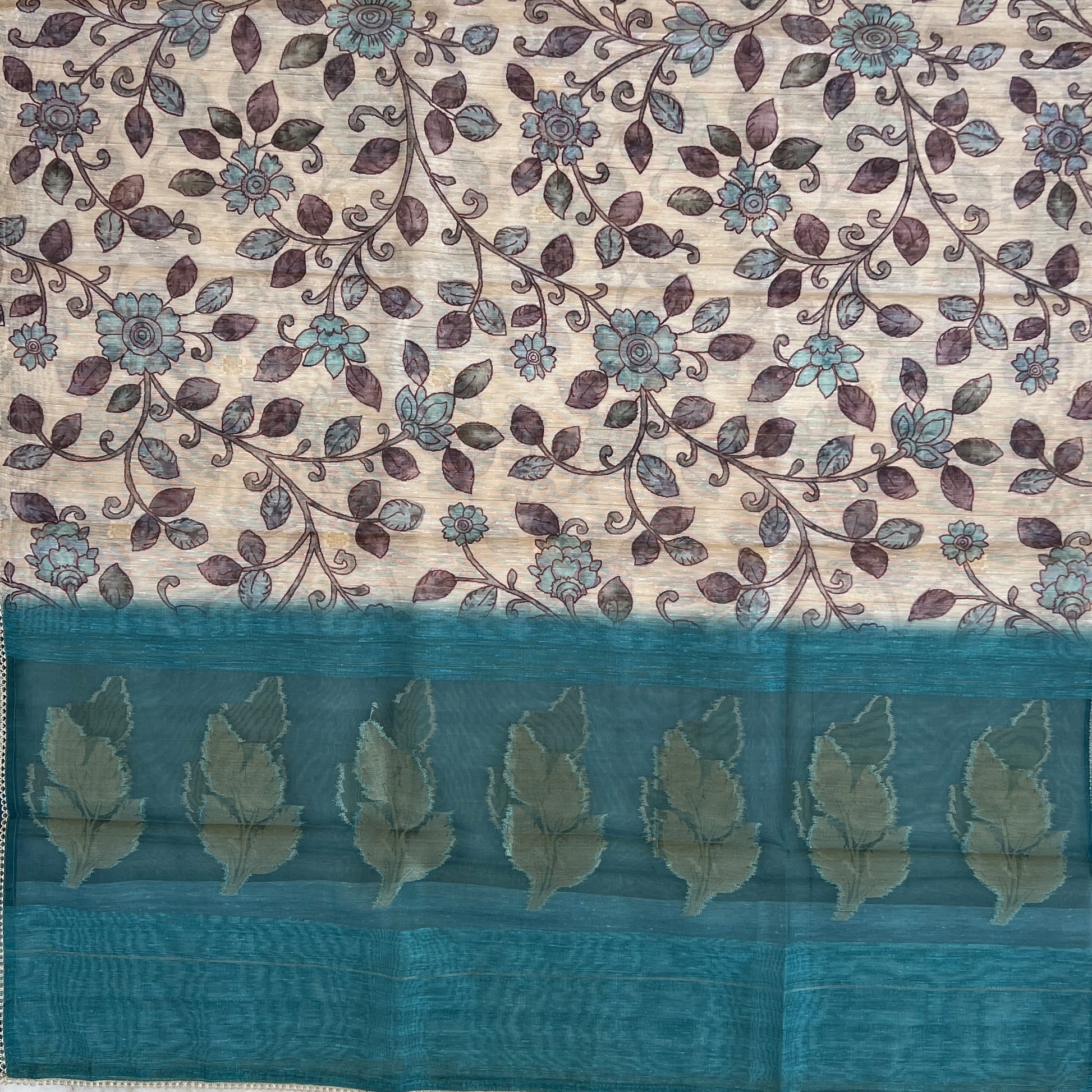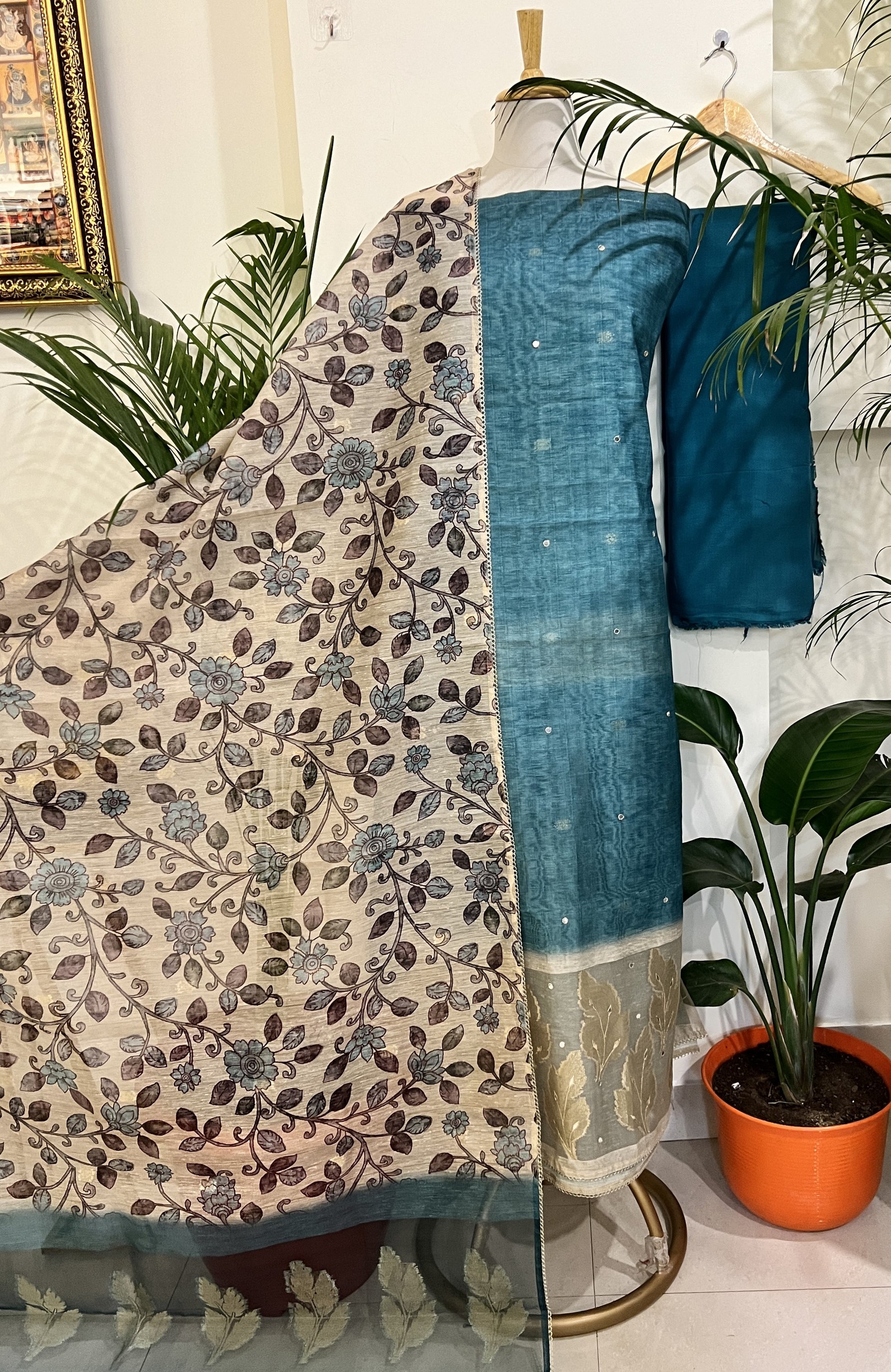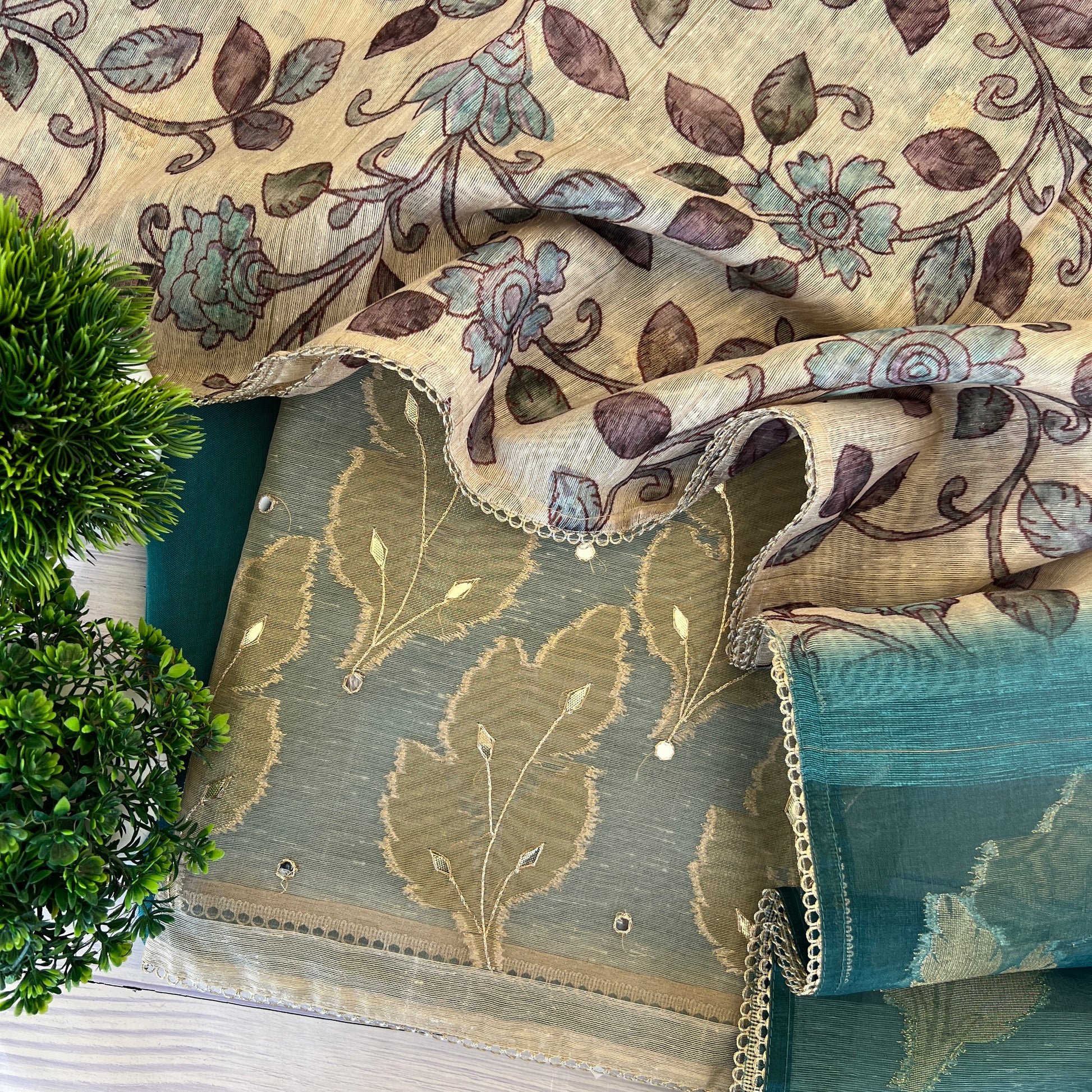 Dupatta - Fine Slub Linen Chanderi Ghotta Work Dupatta With Kalamkari Print (2.5Mtr)