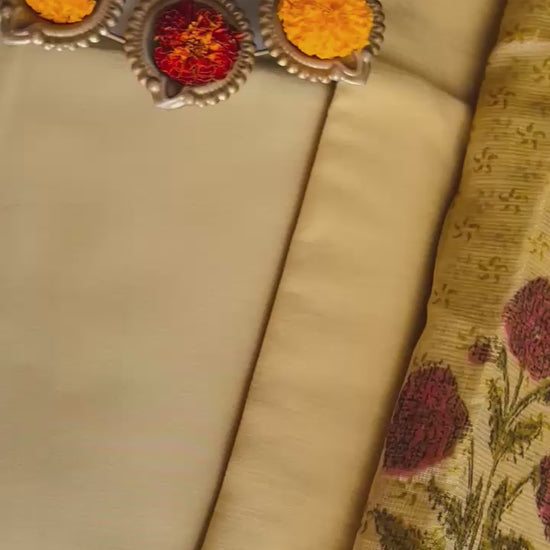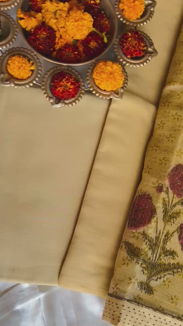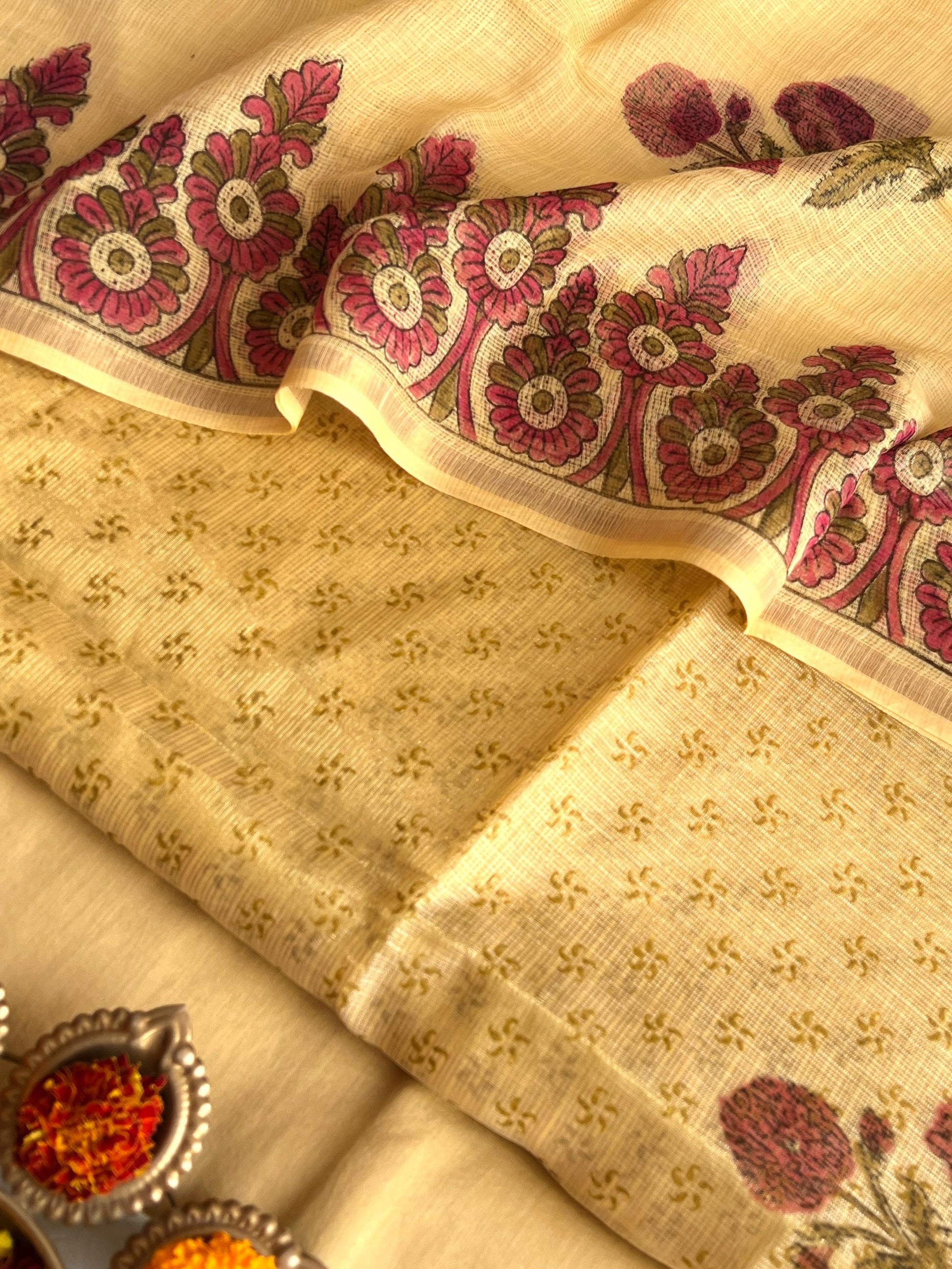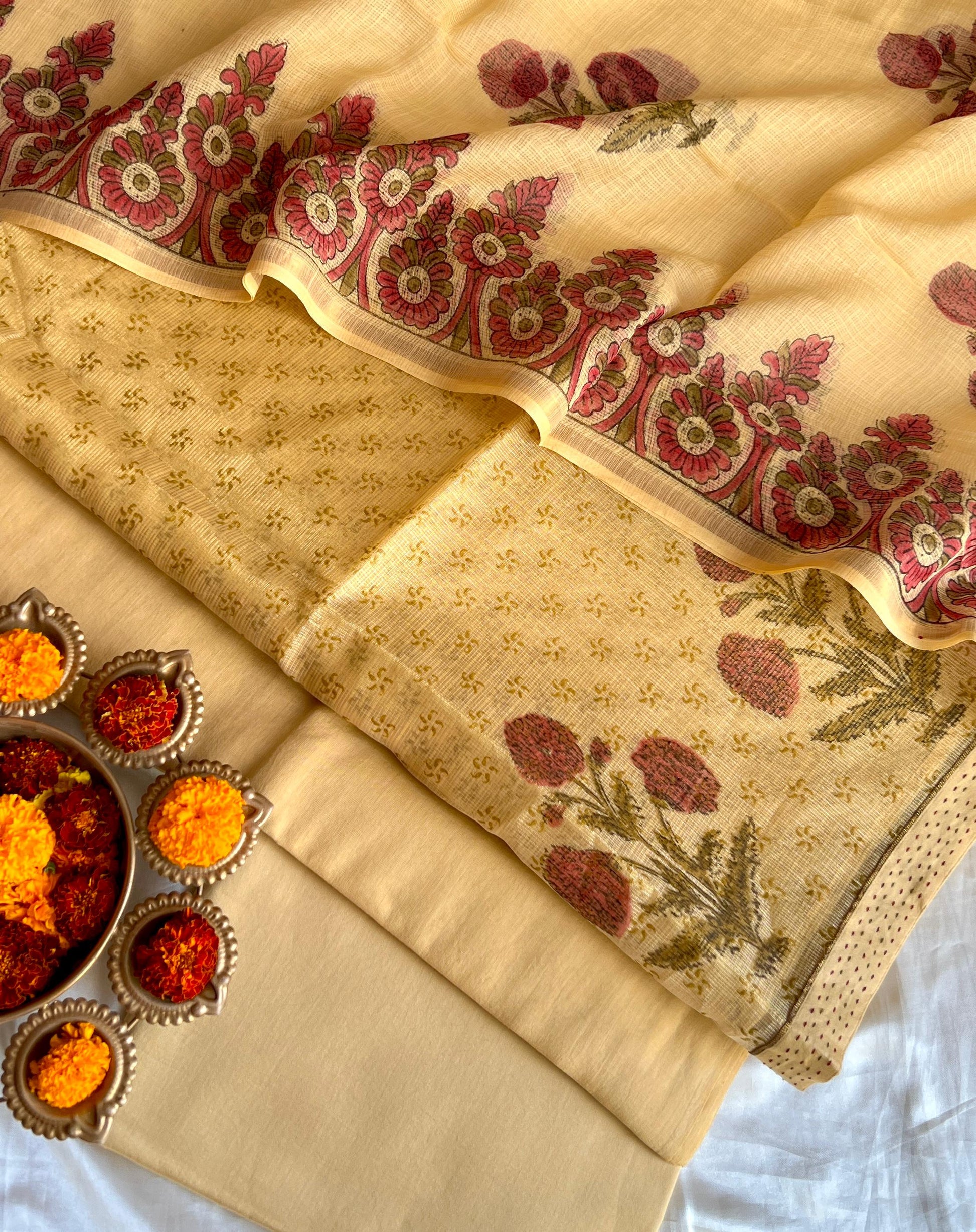 Kurta - Fine Pure Kota Tissue Block Print Kurta With Fine Kantha Detailing At Daman (2.5Mtr) (Lining Fabric Included 2.5Mtr)