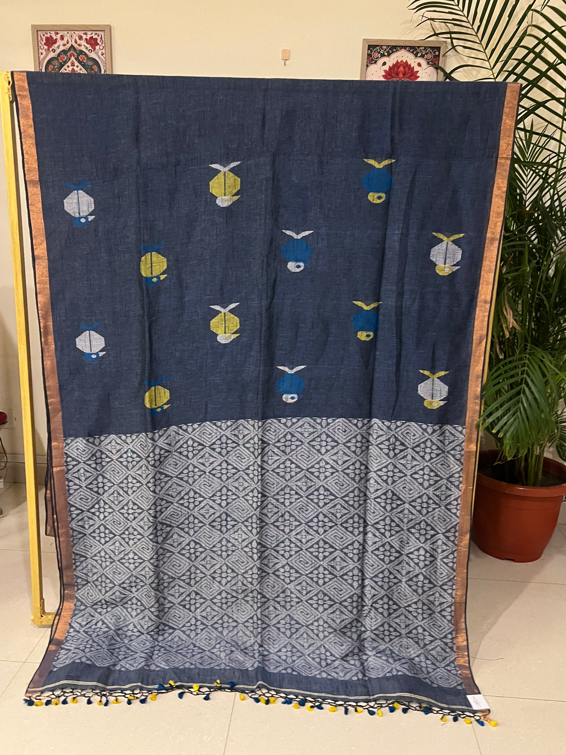 Elegantly handwoven in fine linen, featuring intricate Jamdani motifs and finished with delicate tussles. A perfect blend of comfort and timeless charm for everyday elegance and special occasions. 🌿💫