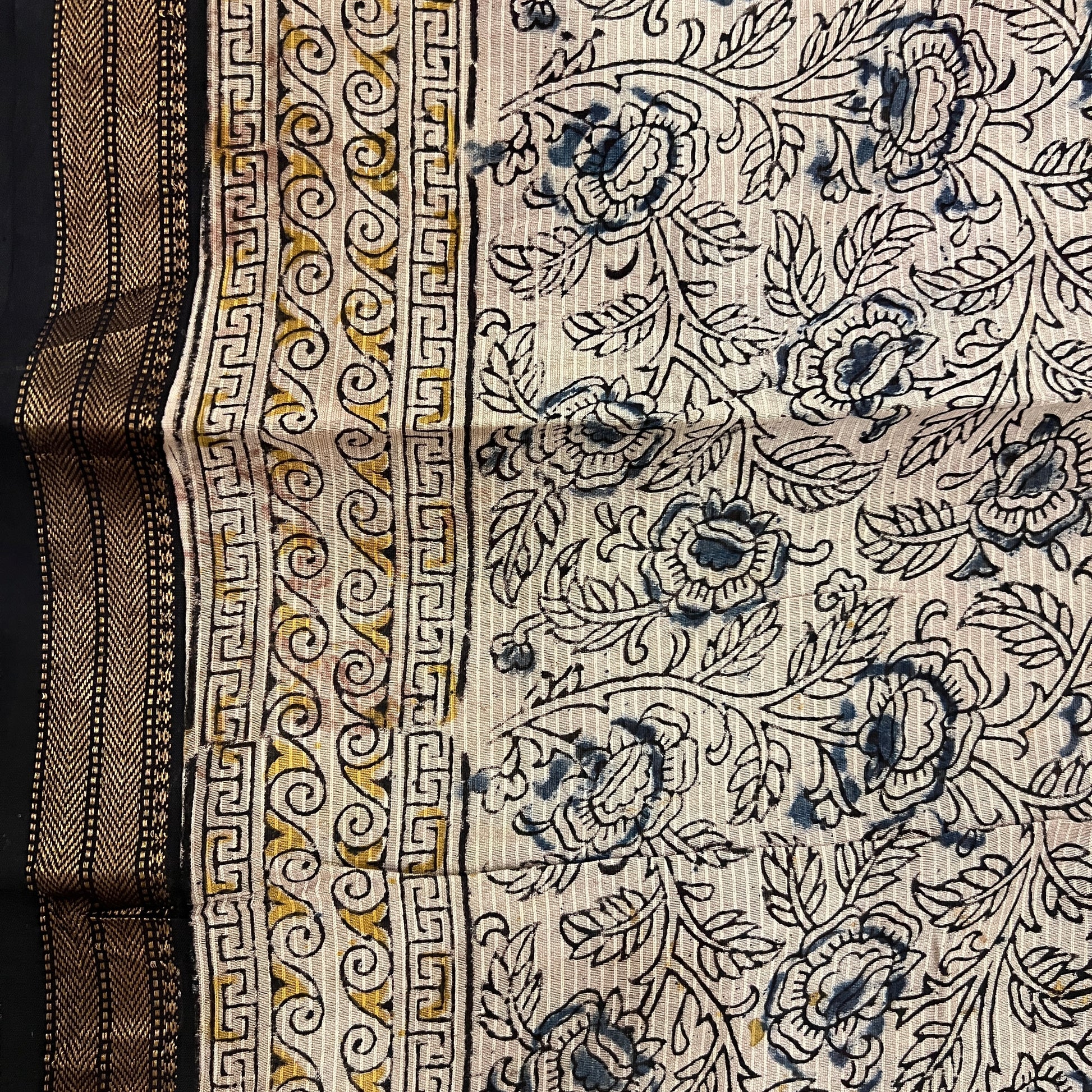 Pure Maheshwari Silk Kalamkari Saree – Featuring exquisite hand-drawn Kalamkari motifs on lustrous Maheshwari silk, highlighted with a classic temple border. A timeless drape for elegance and grace.