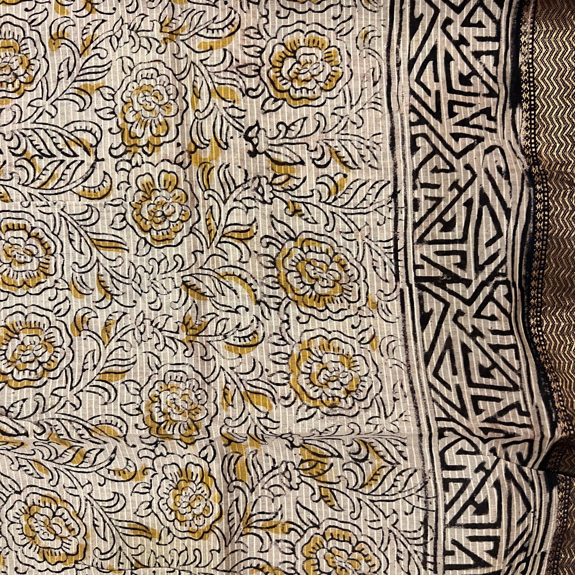 Pure Maheshwari Silk Kalamkari Saree – Featuring exquisite hand-drawn Kalamkari motifs on lustrous Maheshwari silk, highlighted with a classic temple border. A timeless drape for elegance and grace.