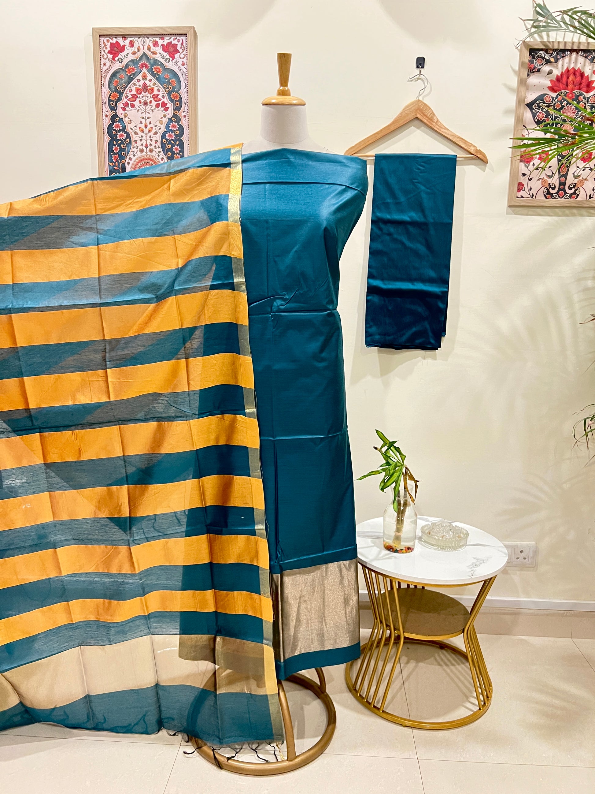 Kurta - Fine Soft Malai Chanderi Kurta With Golden Tissue Woven Border At Daman (2.5Mtr)