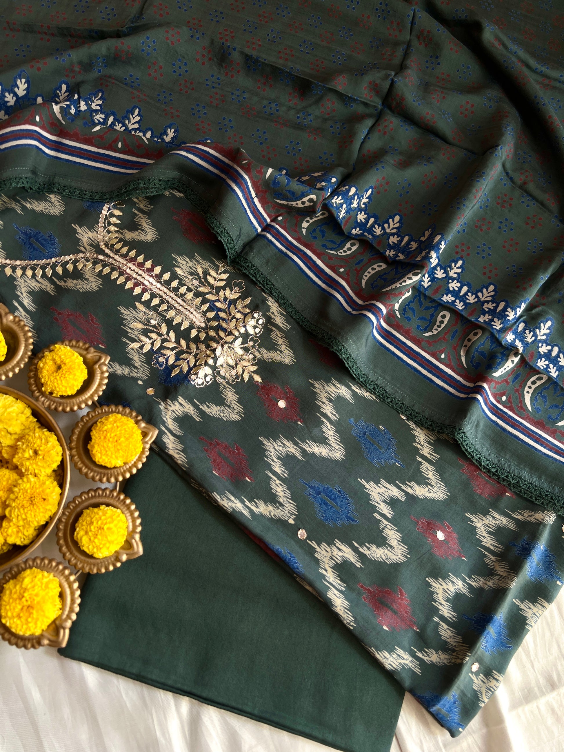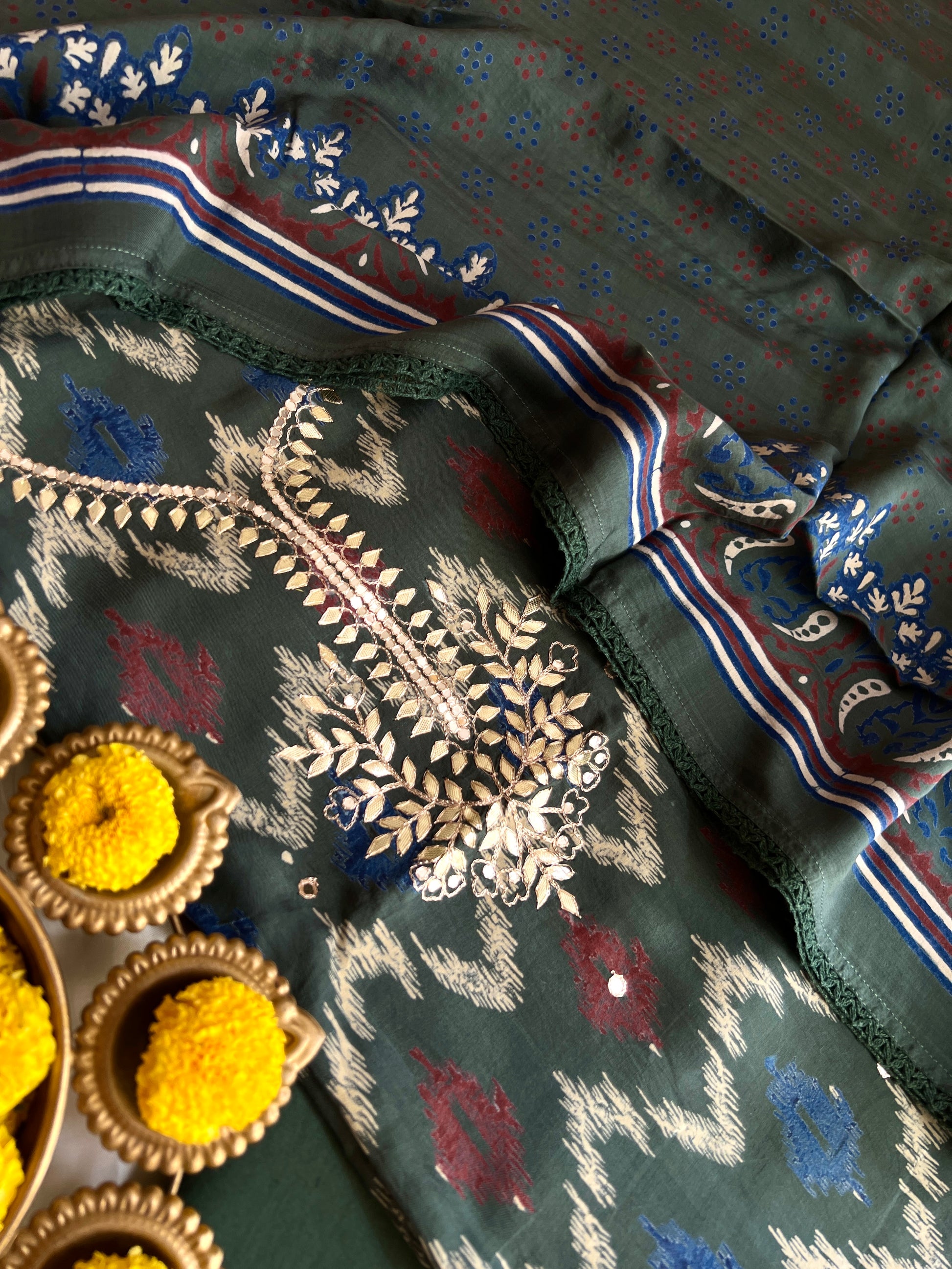 Kurta - Soft Muslin Ikat Print Kurta With Fine Ghota Handwork Detailing At Neckline (2.5Mtr)