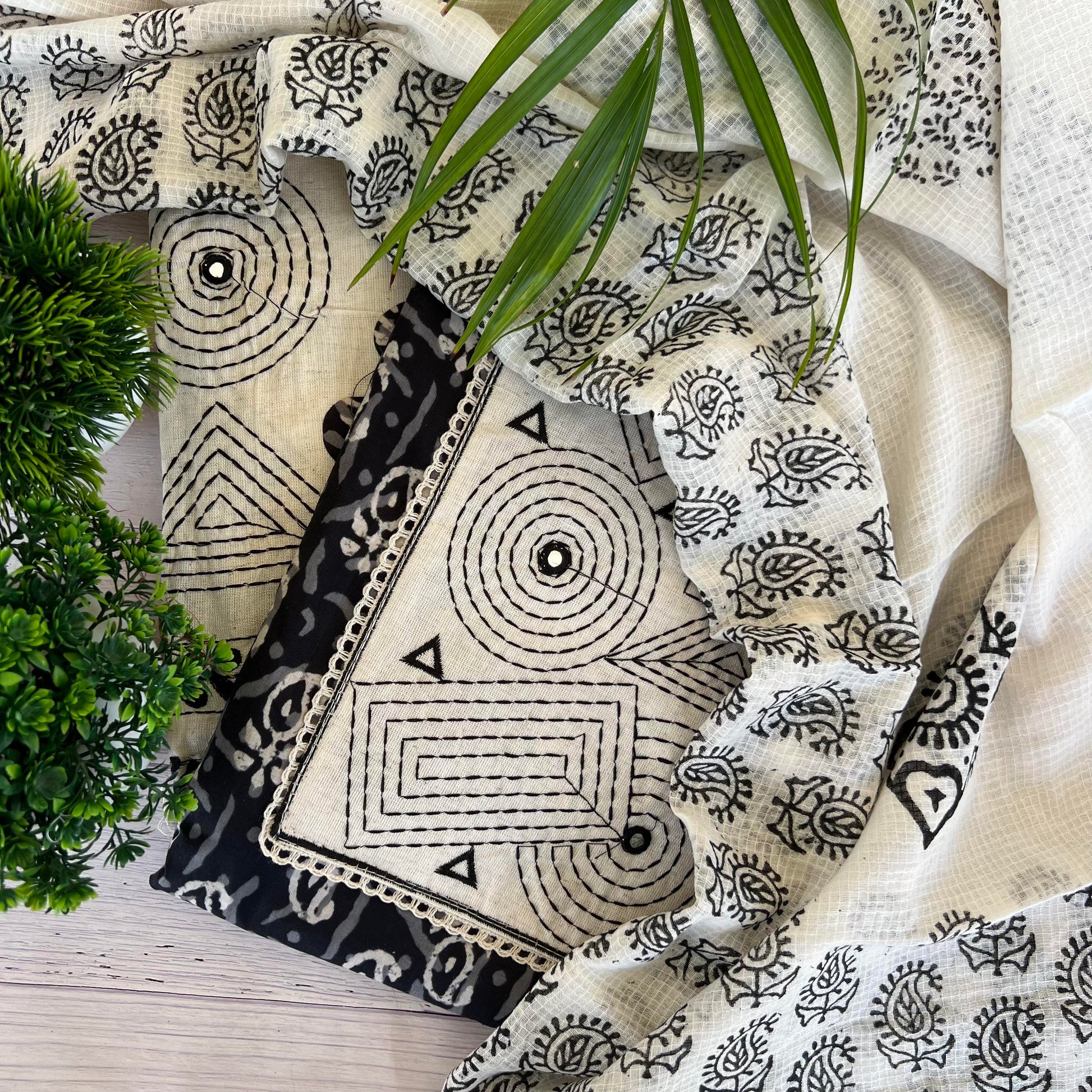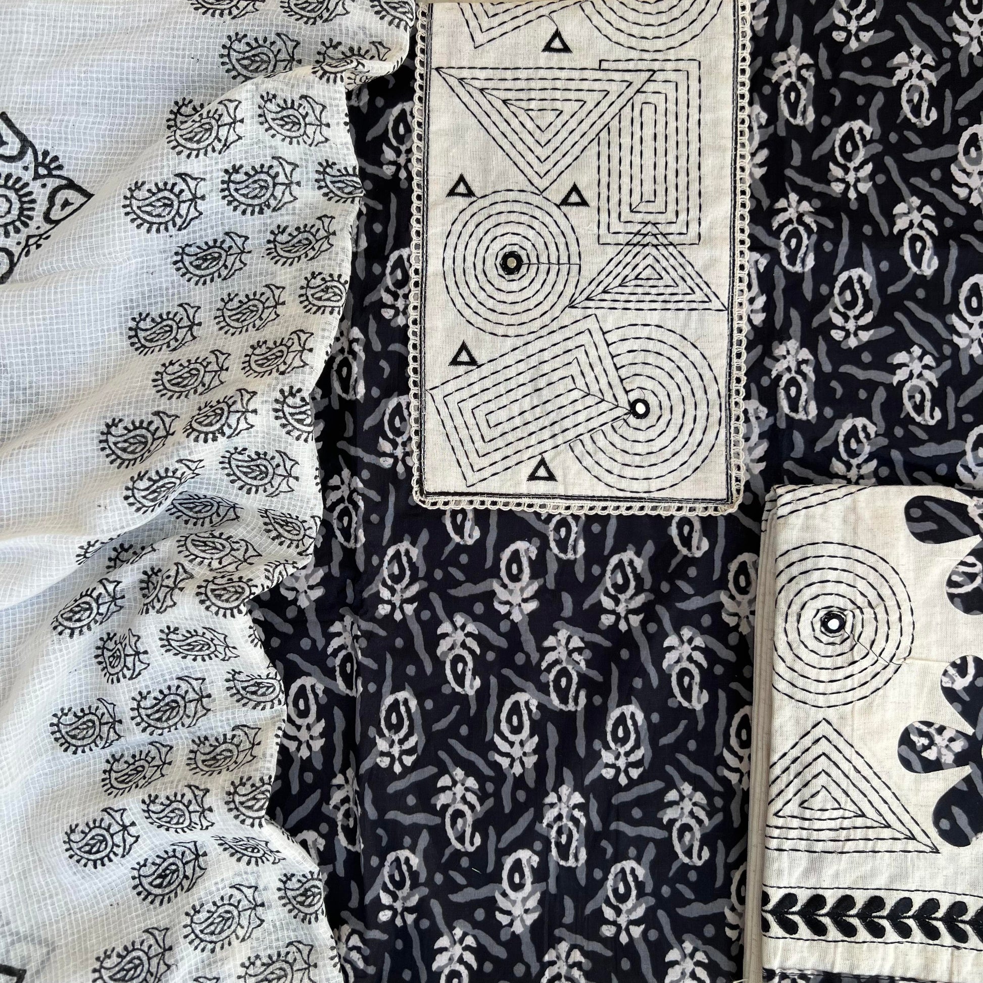 Kurta - Pure Cotton Dabu Block Print Kurta With Kantha Patch Work (2.5Mtr)
