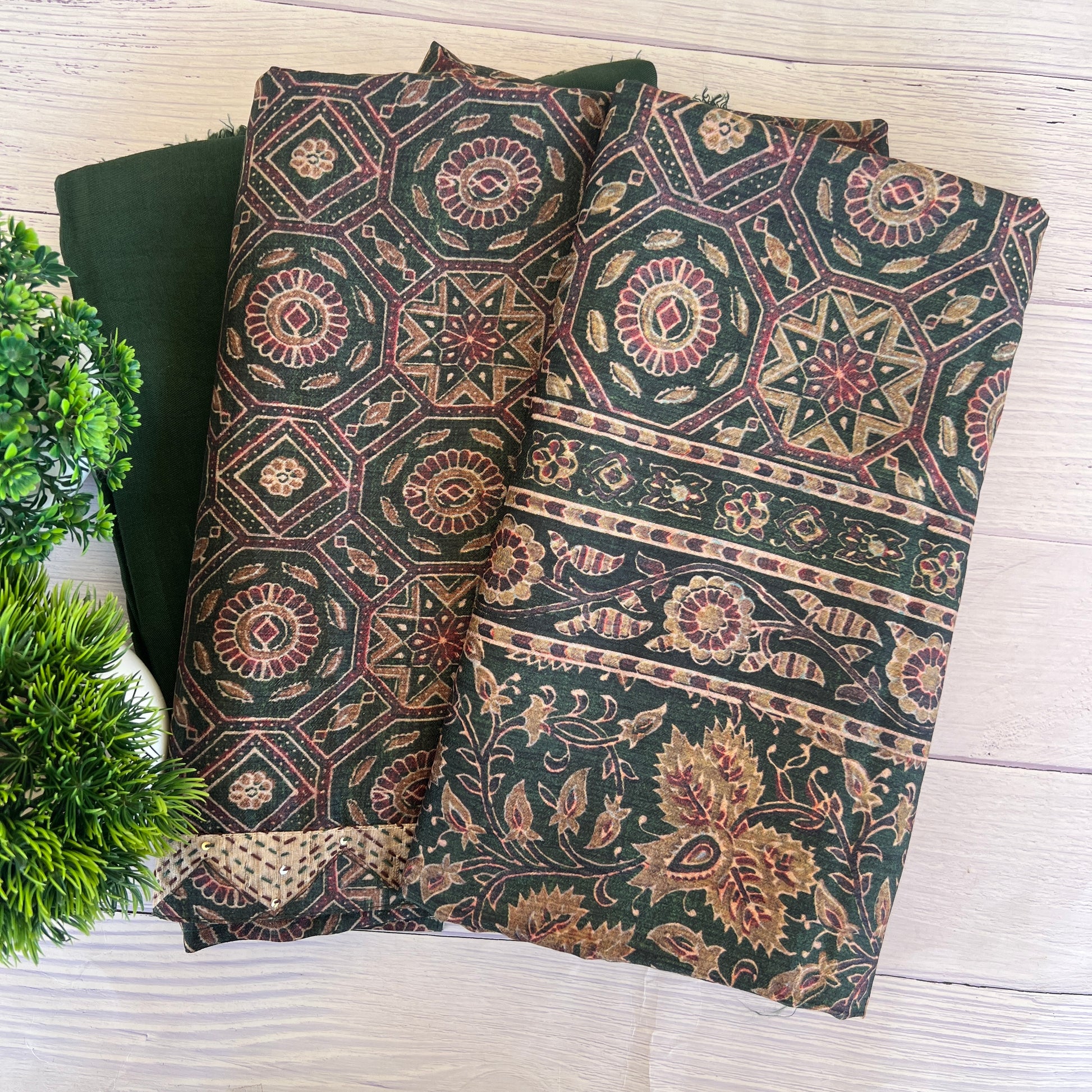 Kurta - Semi Giccha Tusser Ajrakh Print Kurta With Fine Kantha Work At Daman (2.5Mtr)