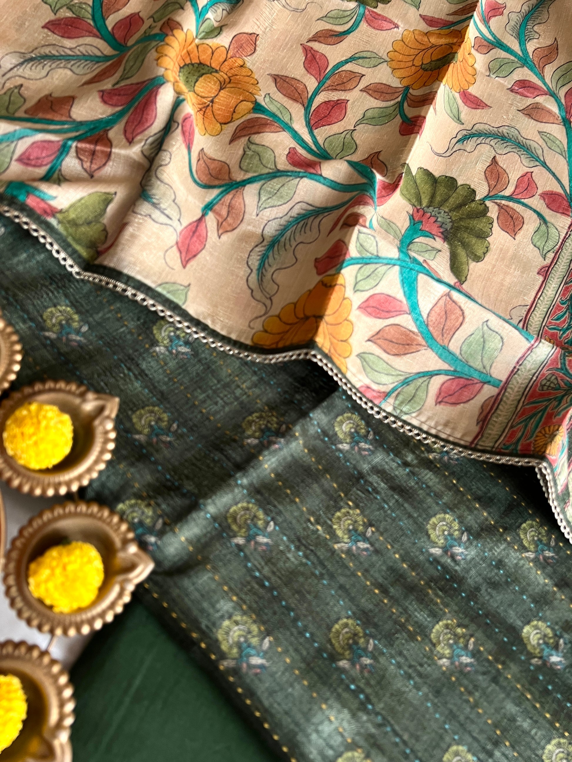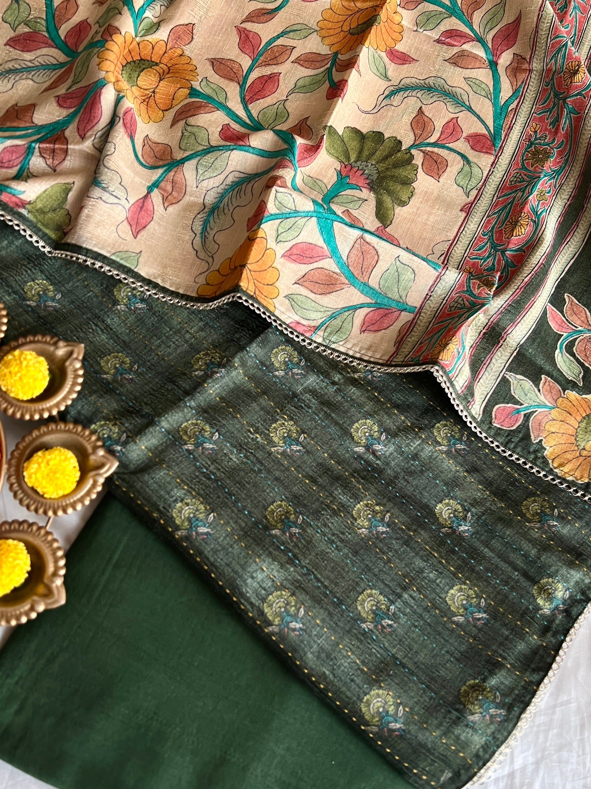 Kurta - Semi Tussar Digital Print Kurta With Kantha Work Detailing All Over The Kurta (2.5Mtr)