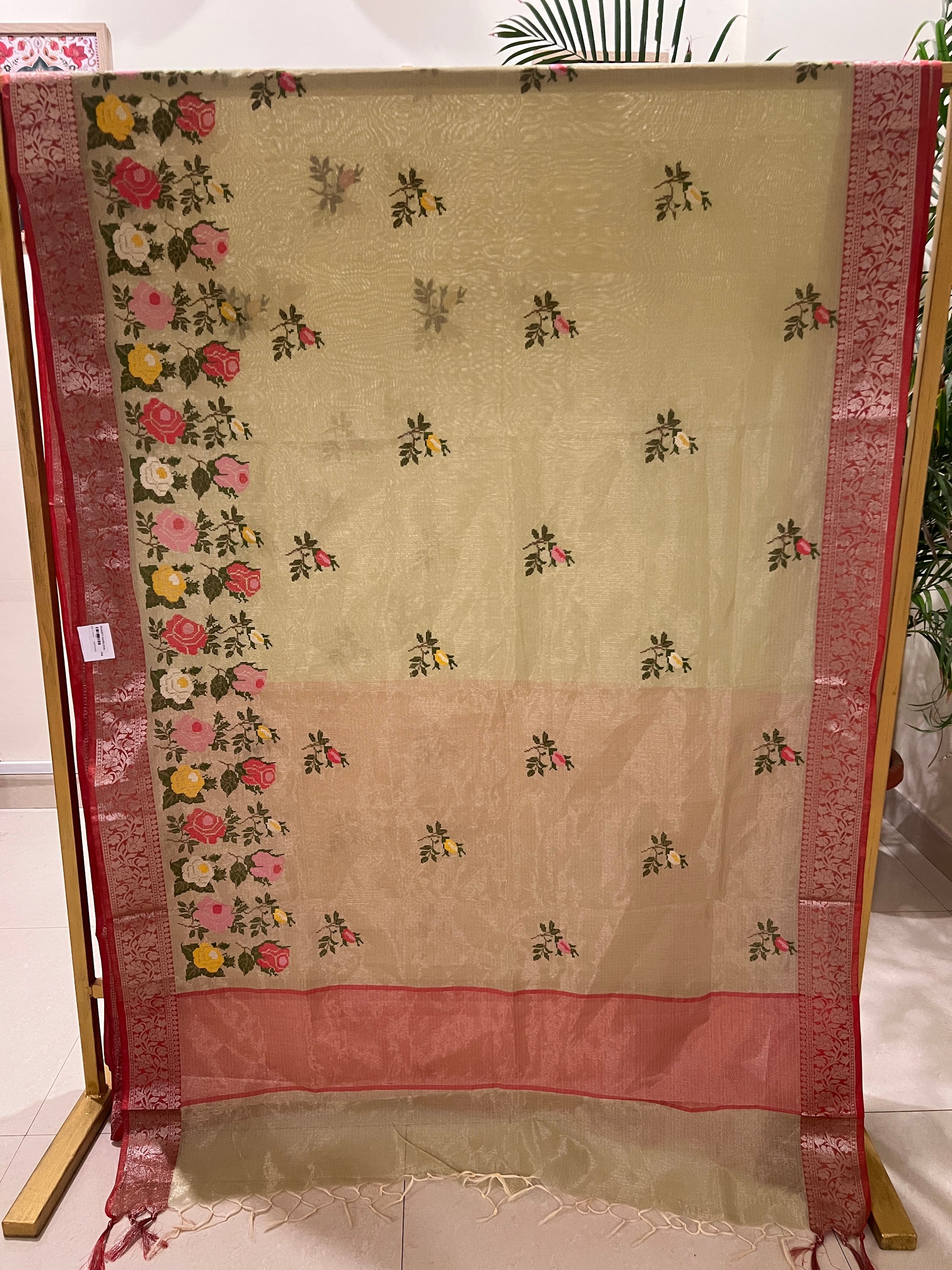 Elegant Tissue Doriya Saree adorned with Banarasi border and delicate cross-stitch embroidery all over. ✨