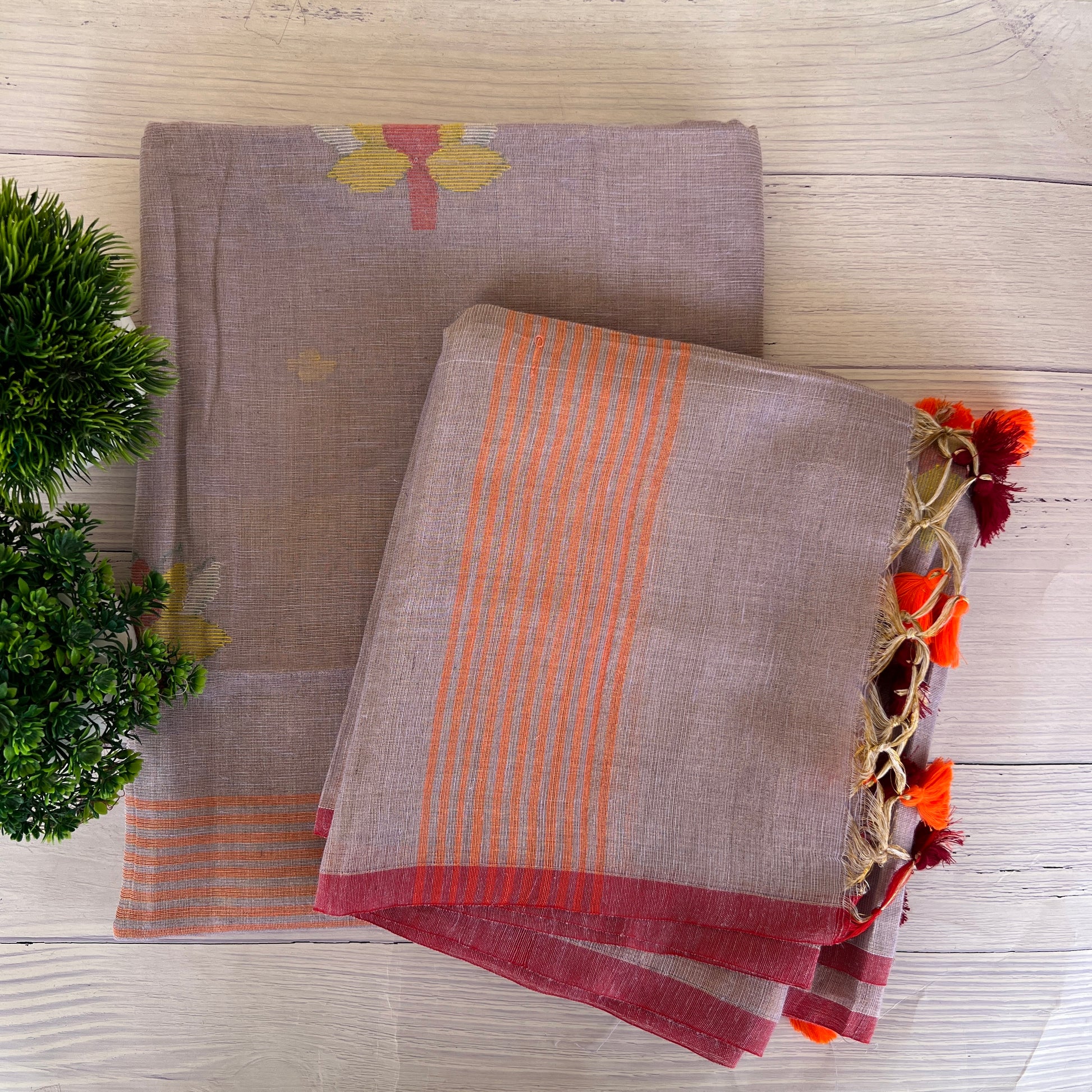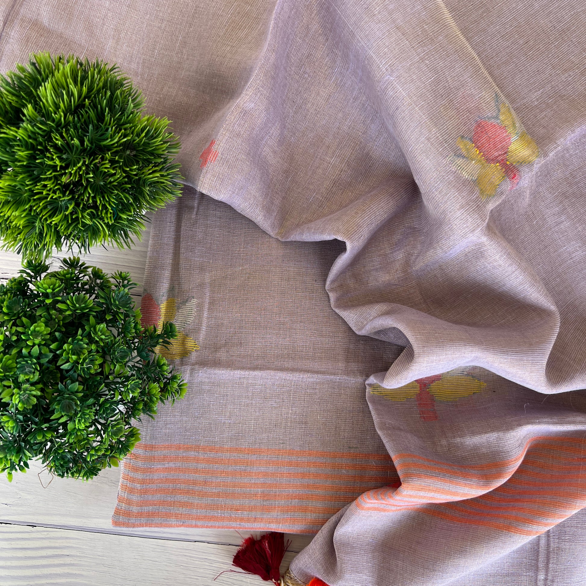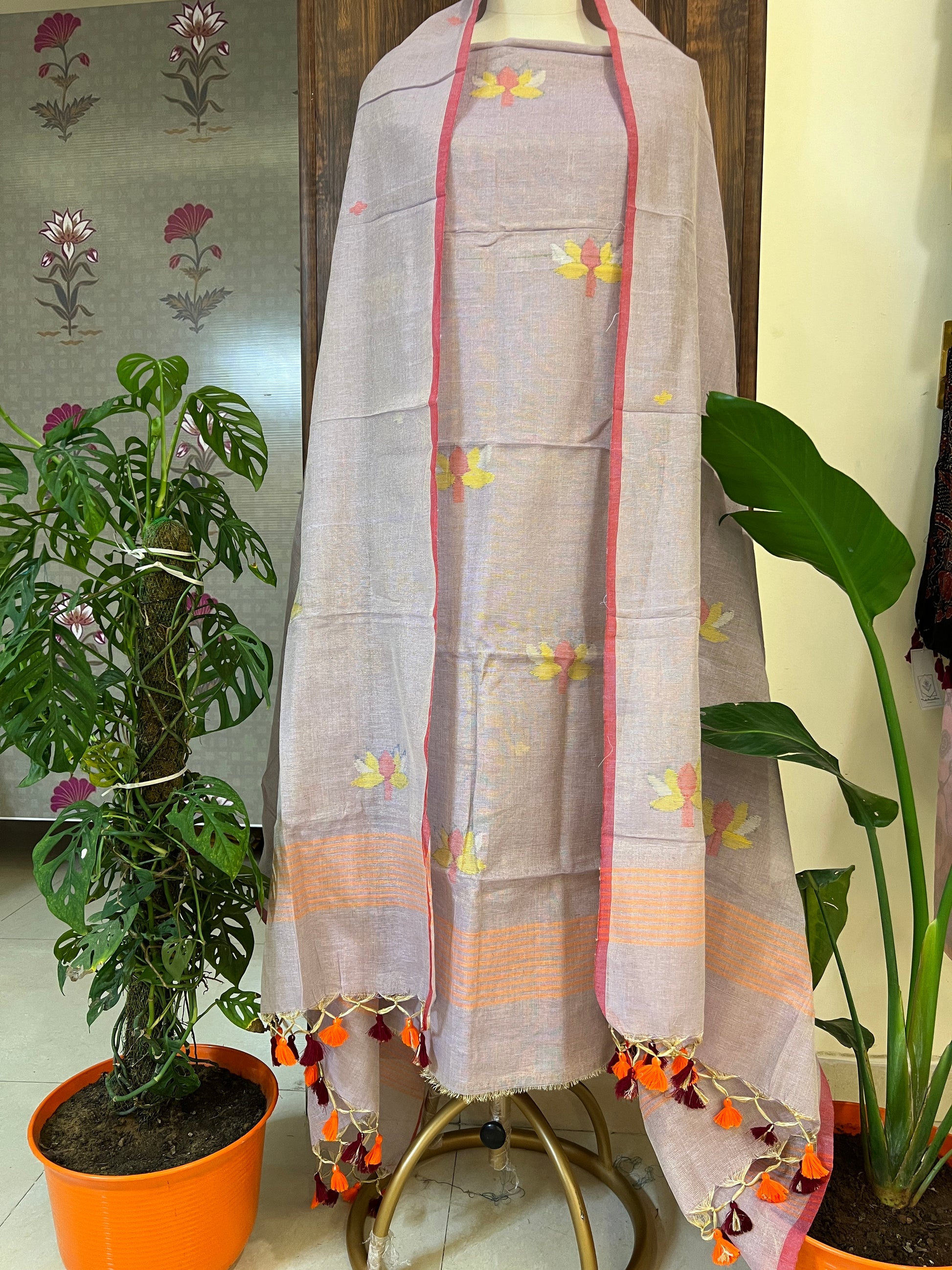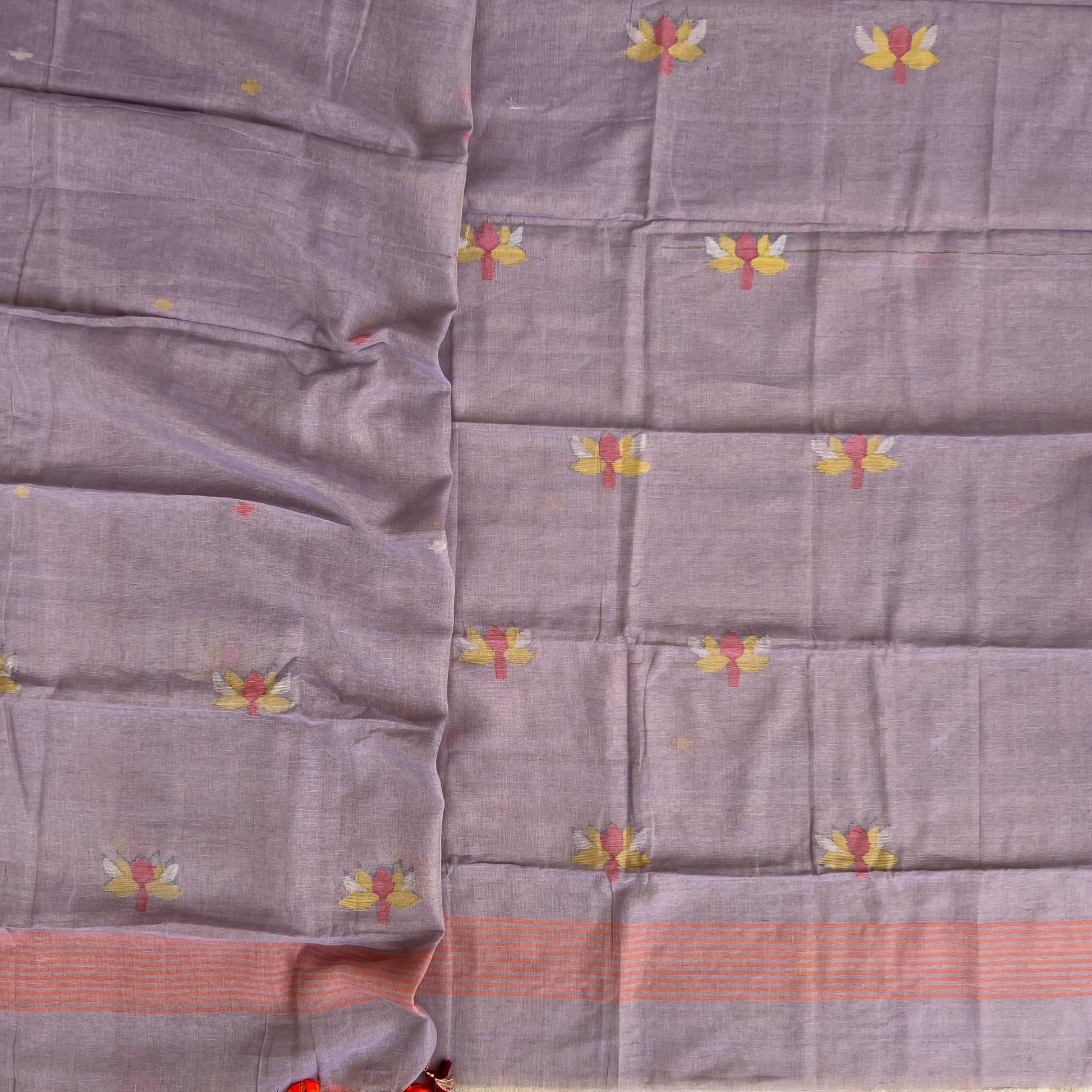 Dupatta - Tissue Silk Jamdani Handwoven Dupatta With Handmade Tussles (2.5Mtr)
